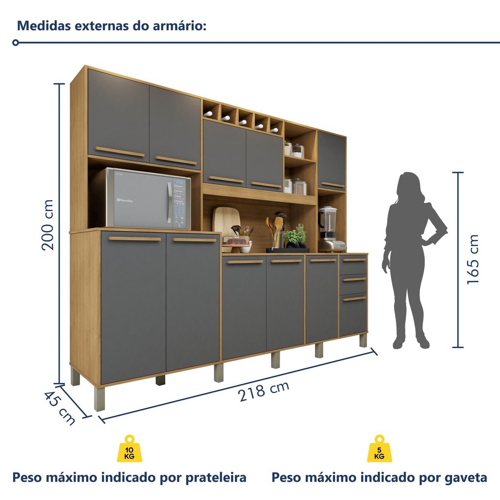 Deixe sua cozinha mais prática e elegante com nosso armário de cozinha com adega e nichos! Com amplo espaço para organizar panelas, eletrodomésticos ou até mesmo aquela bagunça do dia a dia, esse armário une organização e estilo de forma incrível. Nosso armário de cozinha com espaço para micro-ondas é ideal para quem ama cozinhar com elegância. Ele vai deixar sua cozinha muito mais funcional e moderna. Não deixe essa oportunidade de dar um upgrade na sua casa passar. É um armário para cozinha pequena? Sim, ele cabe em vários ambientes e diversas decorações para cozinha. O armário é fácil de instalar? Tem um processo de média dificuldade de instalação. Estilo: Moderno Modular: Sim Peso (kg): 90.5 Garantia: 03 Meses Altura (cm): 200 Acabamento: Pintura UV Largura (cm): 218 Possui Pés: Sim Possui Portas: Sim Tipo de Porta: Bater Altura dos Pés: 15 Pés Reguláveis: Sim Possui Gavetas: Sim Possui Rodízio: Não Suporta Até (kg): 80 Profundidade (cm): 45 Escala de Brilho: Brilhante Gaveta com Chave: Não Material dos Pés: Polipropileno Material da Porta: MDF/MDP Origem do Produto: Nacional Acabamento dos Pés: Cromado Ambiente Principal: Cozinha Material da Gaveta: MDP Material Principal: MDP Possui Prateleiras: Sim Acabamento da Porta: Pintura Sapatas Niveladoras: Sim Acabamento da Gaveta: Pintura Texturizada UV Material da Corrediça: Metálica Material da Prateleira: MDP Peso Máximo por Gaveta: 5 Acabamento da Prateleira: Pintura Texturizada UV Tipo de Puxador da Porta: Externo Escala de Brilho da Porta: Fosco Tipo de Puxador da Gaveta: Externo Escala de Brilho da Gaveta: Fosco Peso Máximo por Prateleira: 15 Tipo de Armário de Cozinha: Cozinha Compacta Tipo de Corrediça da Gaveta: Metálica Telescópica Material do Puxador da Porta: MDF Material do Puxador da Gaveta: MDF Escala de Brilho da Prateleira: Fosco Tipo de Dobradiça/Corrediça da Porta: Simples Material da Dobradiça/Corrediça da Porta: Metálica Marca: Valdemóveis Cor: Cinamomo/Grafite Cor do Produto: Cinamomo/Grafite Itens Inclusos: 1 Armario e Manual de Montagem. Cor Predominante: Cinza Quantidade de Prateleiras: 05 Prateleiras Quantidade de Portas: 11 Portas Quantidade de Gavetas: 02 Gavetas