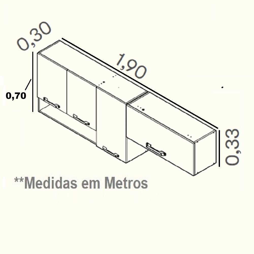 Armário Vegas Itatiaia de 190cm com 3 Portas Verticais e 1 Porta Horizontal e 1 Nicho, Corpo Madeirado em MDP com Pintura UV, Portas em MDP pintura UV, Portas Horizontas com Pistão articulado a Gás, Puxadores em PS com Acabamento Metalizado. Modular: Sim Peso (kg): 34 Garantia: 12 Meses Altura (cm): 70 Acabamento: Pintura UV Largura (cm): 190 Possui Pés: Não Possui Portas: Sim Tipo de Porta: Misto (Bater e Basculante) Possui Gavetas: Não Suporta Até (kg): 35 Acompanha Tampo: Não Profundidade (cm): 30 Escala de Brilho: Fosco Material da Porta: MDP Material do Fundo: HDF Origem do Produto: Nacional Ambiente Principal: Cozinha Balcão Suporta Pia: Não Material Principal: MDP Possui Prateleiras: Sim Acabamento da Porta: Pintura UV Quantidade de Peças: 1 Balcão Acompanha Pia: Não Material da Prateleira: MDP Acabamento da Prateleira: Pintura UV Tipo de Puxador da Porta: Externo Escala de Brilho da Porta: Fosco Espessura da Estrutura (mm): 15 Peso Máximo por Prateleira: 14 Tipo de Armário de Cozinha: Armário Aéreo Possui Recorte para Cooktop: Não Material do Puxador da Porta: ABS Escala de Brilho da Prateleira: Fosco Material da Dobradiça/Corrediça da Porta: Metálica Marca: Itatiaia Cor Interna: Cinamomo Cor do Produto: Cinamomo/Grafite Intenso Itens Inclusos: 1 armário 190cm Cor Predominante: Cinza Linha ou Coleção: Vegas Quantidade de Prateleiras: 02 Prateleiras Quantidade de Portas: 4 Portas Tamanho Indicado da Pia (L x C): não usa tampo Quantidade de Gavetas: Não Possui Quantidade do Produto: 1 Tamanho Indicado do Tampo (L x P): não usa tampo nesse produto