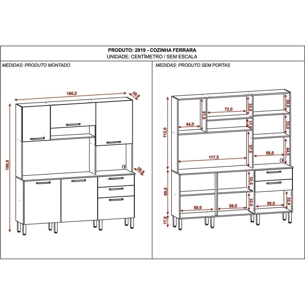 Cozinha Ferrara traz a tona todo o conceito de amplitude e organização para o ambiente, amplas repartições e nichos compõe a peças para melhor dispor de objetos e afins, contém também espaço para forno ou micro, trazendo a praticidade de ter tudo em um só produto. Além de respeitar o meio ambiente a cozinha Ferrara vem com o acabamento em pintura com secagem em luzes UV. Estilo: Moderno Modular: Não Peso (kg): 78.15 Garantia: 03 Meses Altura (cm): 198 Acabamento: Pintura Texturizada UV Largura (cm): 180.2 Possui Pés: Sim Possui Vidro: Não Possui Portas: Sim Tipo de Porta: Misto (Bater e Basculante) Altura dos Pés: 17 Pés Reguláveis: Sim Possui Gavetas: Sim Possui Rodízio: Não Suporta Até (kg): 114 Acompanha Tampo: Não Profundidade (cm): 38.8 Escala de Brilho: Fosco Gaveta com Chave: Não Material dos Pés: Polipropileno Material da Porta: MDP Origem do Produto: Nacional Acabamento dos Pés: Polipropileno Ambiente Principal: Cozinha Balcão Suporta Pia: Não Material da Gaveta: MDP Material Principal: MDP Possui Prateleiras: Sim Acabamento da Porta: Pintura Quantidade de Peças: 1 Sapatas Niveladoras: Não Acabamento da Gaveta: Pintura Texturizada UV Balcão Acompanha Pia: Não Material da Corrediça: Metálica Material da Prateleira: MDP Peso Máximo por Gaveta: 10 Acabamento da Prateleira: Pintura Texturizada UV Tipo de Puxador da Porta: Externo Escala de Brilho da Porta: Fosco Tipo de Puxador da Gaveta: Externo Escala de Brilho da Gaveta: Fosco Peso Máximo por Prateleira: 5 Tipo de Armário de Cozinha: Cozinha Compacta Possui Recorte para Cooktop: Não Tipo de Corrediça da Gaveta: Metálica Telescópica Material do Puxador da Porta: Poliestireno Material do Puxador da Gaveta: Poliestireno Escala de Brilho da Prateleira: Fosco Informações Complementares (Novo): Considerar um peso bem distribuído por todo o produto. Material da Dobradiça/Corrediça da Porta: Metálica Marca: Kits Paraná Cor Interna: Freijó Cor: Freijó/Soft Cor do Produto: Freijó/Soft Itens Inclusos: 1 Armário, Kit Ferragens e Manual de Montagem Cor Predominante: Bege Linha ou Coleção: Cozinhas Compactas Quantidade de Prateleiras: 05 Prateleiras Tamanho Indicado da Pia (L x C): Não Possui Balcão Quantidade de Gavetas: 02 Gavetas Tamanho Indicado do Tampo (L x P): Não Possui Balcão