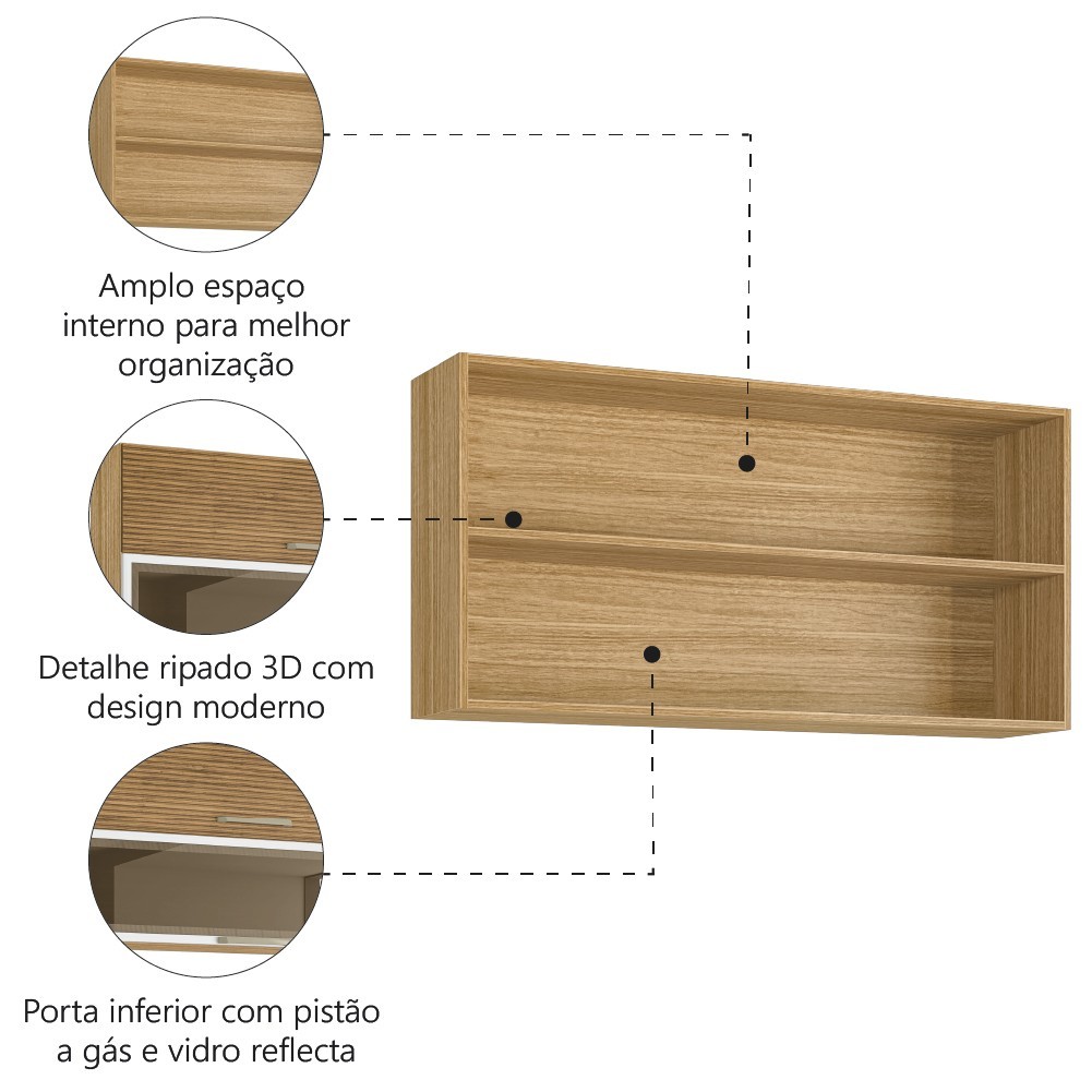 Armário De Cozinha Aéreo 2 Portas 1,20m Com Vidro Reflecta Módulo Suspenso Madeirado / Branco Ametista