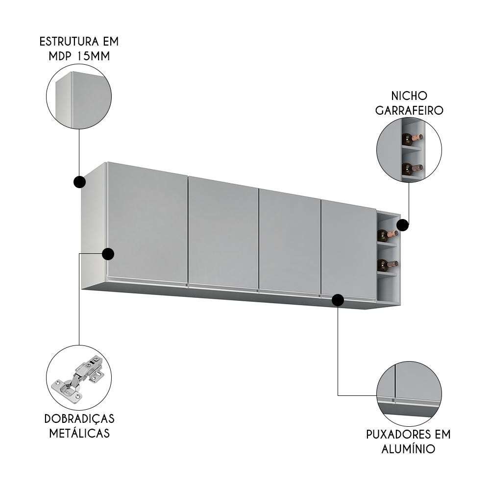 Armário de Cozinha Aéreo Nevada com Nicho 180cm 4 Portas Cinza Claro - Lumil