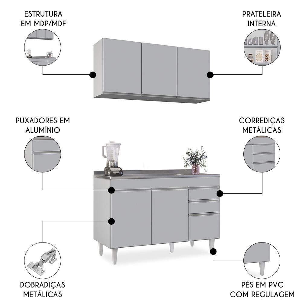 Armário de Cozinha Aéreo Virgínia e Balcão Com Pia 120cm Michigan Cinza Claro - Lumil