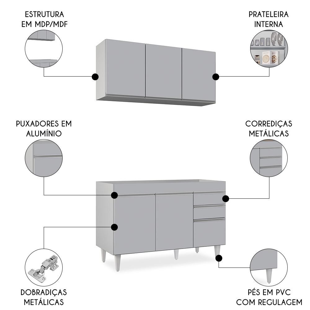 Armário de Cozinha Aéreo Virgínia e Balcão Para Pia 120cm Michigan Cinza Claro - Lumil