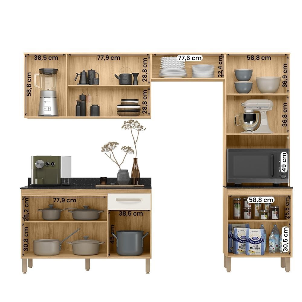 Apresentamos o Armário de Cozinha Fit, um modelo elegante e espaçoso para a sua cozinha. Os armários oferecem amplo espaço de armazenamento para utensílios e mantimentos, mantendo sua cozinha organizada e funcional. Com design moderno e funcionalidade excepcional, esta cozinha é a escolha ideal para quem busca praticidade e elegância. Modelo: Cozinha com Balcão Fit; Altura do Armário: 208,5 cm; Largura do Armário: 261,2 cm; Profundidade do Armário: 43 cm; Altura do Balcão: 85,7 cm; Largura do Balcão: 120 cm; Profundidade do Balcão: 43 cm; Material da estrutura: MDP; Quantidade de portas: 11, sendo 2 com detalhe em vidro 3mm; Material de dobradiças: Metálicas; Quantidade de Gavetas: 01; Material da corrediça: telescópicas; Com puxador: Sim, plástico; Quantidade prateleiras: 03; Pés com regulagem: Sim; Peso suportado do Armário: até 80 kg distribuídos; Peso suportado do balcão: até 30 kg distribuídos; Requer montagem: Sim (kit montagem incluso); Embalagem do envio: Papelão e plástico; Informações adicionais: - Os objetos que ambientam as fotos não acompanham o produto; - É de inteira responsabilidade do cliente a montagem do produto e/ou instalação, assim como possíveis irregularidades provenientes de manuseio inadequado; - Embora o produto acompanhe o manual de montagem, verifique a complexidade antes de decidir montá-lo sozinho, recomendamos que contrate um profissional de sua confiança; - Fique atento, nossas cores podem sofrer alterações dependendo do seu monitor; - ANTES DE MONTAR O SEU PRODUTO, verifique se há alguma peça danificada, caso esteja, prestaremos a devida assistência dentro do prazo da garantia.