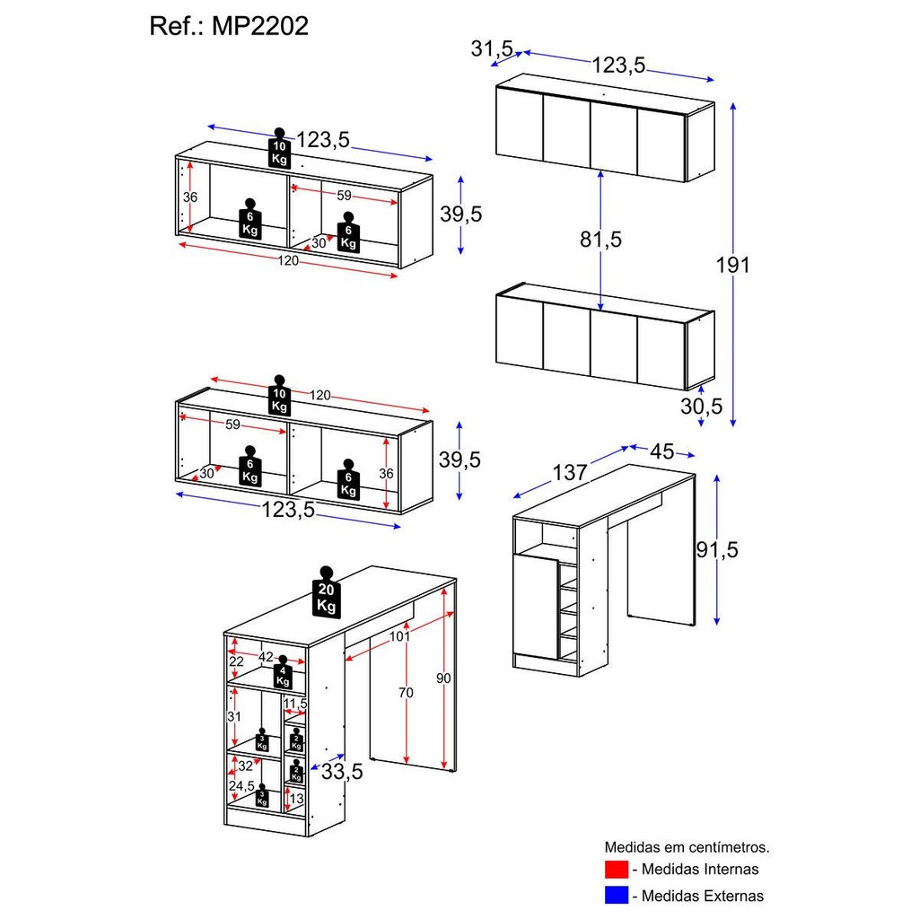 O Armário de Cozinha com Bancada Americana/Mesa Gourmet Multimóveis MP2202 é produzido em MDP de alta qualidade com acabamento acetinado (cerca de 20% de brilho), garantindo durabilidade e resistência. Suspensos, o balcão (suporta até 10kg) e o armário aéreo possuem 4 portas que escondem um amplo espaço interno, proporcionando a organização que você precisa sem comprometer a estética. Além disso, a bancada inclusa conta com tampo de 15mm (suporta até 20kg), 1 porta, prateleira interna e adega embutida, adicionando um toque de sofisticação ao seu ambiente e facilitando na hora de servir bebidas às visitas. A versatilidade deste conjunto é um destaque, já que a bancada pode ser utilizada também como uma divisora de ambientes, permitindo que você crie espaços funcionais e visualmente atraentes em sua casa. Este kit é uma ótima opção para deixar sua cozinha mais organizada e prática! Conteúdo da Embalagem: 1 (um) Balcão 1 (um) Armário Aéreo 1 (uma) Bancada/Mesa Manual de Montagem Kit Ferragem Dimensões do produto montado: Armário Aéreo - Altura: 39,5cm | Largura: 123,5cm | Profundidade: 31,5cm Balcão - Altura: 39,5cm | Largura: 123,5cm | Profundidade: 31,5cm Bancada/Mesa - Altura: 91,5cm | Largura: 137cm | Profundidade: 45cm *Você pode consultar as medidas detalhadas na imagem técnica do produto. *As cores do produto podem sofrer variações de tonalidade de acordo com as configurações do seu dispositivo. Imagem meramente ilustrativa. Decoração e eletros não acompanham o produto. O produto será entregue desmontado e não disponibilizamos o serviço de montagem.