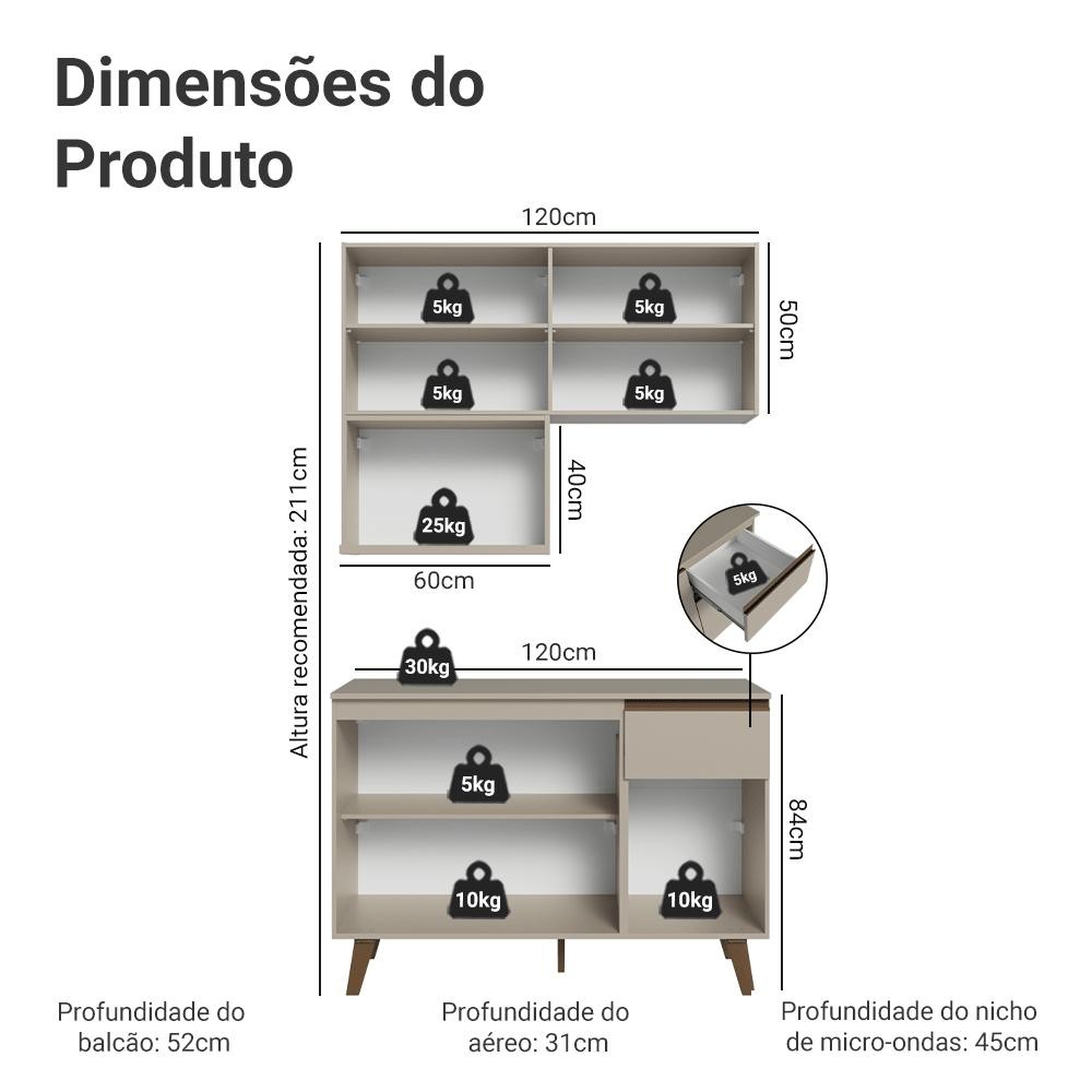 A Cozinha Compacta de 120 cm da linha Nice combina o visual moderno e sofisticado com a praticidade e funcionalidade que você precisa. Um dos grandes diferenciais dessa cozinha é o nicho aéreo, que oferece espaço para acomodar forno ou micro-ondas, otimizando ainda mais a organização e funcionalidade do ambiente. O acabamento se destaca por sua tonalidade sofisticada e atemporal, transmite modernidade, adaptando-se a diferentes estilos de decoração. Produzido com materiais de qualidade, o balcão possui dobradiças metálicas nas portas e puxadores em perfil de alumínio, garantindo resistência. As gavetas possuem corrediças que permitem abertura total, oferecendo mais praticidade. O tampo é removível, possibilitando a instalação de cuba ou pedra e o acabamento é de alta resistência, garantindo durabilidade no uso diário. Medidas totais: - 211 cm de altura - 120 cm de largura - 52 cm de profundidade no balcão, 31 cm no aéreo e 45 cm no nicho de micro-ondas O que você recebe: - Um Armário Aéreo de 120 cm com duas portas - Um Nicho aéreo de 60 cm com espaço para forno - Um Balcão de 120 cm com três portas e uma gaveta Código do produto: XMGRNC1200053B XMGRNC1200057P É importante saber: - Material: MDP - Imagens meramente ilustrativas, a decoração não acompanha o produto. - A Madesa não oferece serviço de montagem. - O produto segue com manual e todas as ferragens necessárias para a instalação. A Madesa possui compromisso com a sustentabilidade. Geramos energia limpa em nossa própria usina, priorizamos fornecedores responsáveis e utilizamos plástico reciclado em nossa produção. Além disso, reinserimos sobras no ciclo de reciclagem e investimos no desenvolvimento de nossos colaboradores e da comunidade. Garantia: Este produto conta com 1 ano de garantia total, sendo 3 meses de garantia legal e 9 meses de garantia contratual. A garantia cobre exclusivamente defeitos de fabricação e vícios ocultos. Não estão cobertos: problemas decorrentes de montagem incorreta, uso inadequado, exposição à umidade, calor ou luz solar direta, modificações no produto ou desgaste natural.