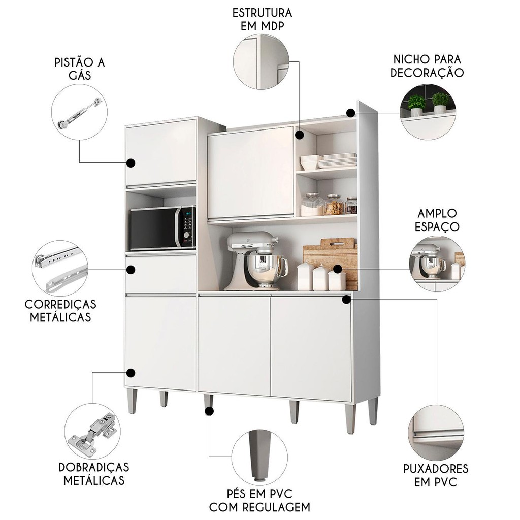 Armário de Cozinha Compacta 160cm 5 Portas Isabel Branco - AJL Móveis Esse Armário de Cozinha é a escolha ideal para quem deseja aliar praticidade, funcionalidade e um ótimo aproveitamento de espaço, sem abrir mão de um visual moderno. Desenvolvido especialmente para ambientes menores, ele proporciona organização e charme a Cozinha, facilitando o dia a dia com soluções inteligentes. Sua estrutura em MDP 12mm/15mm conta com cinco portas no total, sendo três com abertura convencional e duas basculantes equipadas com pistões a gás, que oferecem suavidade e segurança na abertura. Todas as portas possuem dobradiças metálicas, que aumentam a durabilidade, e puxadores em perfil plástico, garantindo leveza e um acabamento limpo ao design. Além disso, o Armário dispõe de uma gaveta com corrediças metálicas, que deslizam com facilidade. Para complementar a organização, há quatro nichos amplos que podem ser usados para acomodar eletroportáteis, itens decorativos ou utensílios de uso frequente. O espaço superior também pode ser aproveitado, tornando o móvel ainda mais funcional. Com pés em PVC reguláveis, garantindo estabilidade mesmo em pisos irregulares. Esse armário é a solução perfeita para tornar sua Cozinha Compacta mais eficiente, organizada e com um toque moderno que valoriza o espaço. ESPECIFICAÇÕES Dimensões do Produto: Largura: 160 cm. Altura: 200 cm. Profundidade: 38 cm. Peso: 68 Kg. Características dos Produtos: Material da Estrutura: MDP. Espessura das Chapas: 12mm/15mm. Peso Suportado: 70 Kg Distribuídos. Acabamento: Pintura UV. Escala de Brilho: Fosco. Possui Pés: Sim. Tipo de Pés: PVC com regulagem. Possui Gaveta: Sim. Quantidade de Gavetas: 1 Gaveta. Tipo de Corrediças: Metálicas. Possui Prateleiras: Sim. Quantidade de Prateleiras: 1 Prateleira. Possui Portas: Sim. Tipo de Dobradiças: Metálicas. Quantidade de Portas: 5 Portas. Tipo de Porta: Basculante/Convencional. Possui Pistão à Gás: Sim. Possui Puxador: Sim. Tipo de Puxador: PVC. Possui Nichos: Sim. Quantidade de Nichos: 4 Nichos. Diferenciais: - Design Moderno. - Amplo espaço interno. - Portas basculantes com pistão à gás. - Nichos para decorações e temperos. Sistema de montagem: Parafusos/ Cavilhas/ Pregos. Manual de montagem: Sim. Complexidade da Montagem: Média. Conteúdo da Embalagem: 1 Kit Cozinha. Volumes: 2 Volumes. Garantia do fabricante: 90 dias contra defeito de fabricação. Montagem: Aconselhamos que seja feita por um profissional. Recomendação de limpeza: Utilize pano levemente úmido. Observações importantes: - Produto para uso residencial em ambiente interno, não devendo ficar exposto diretamente ao sol, calor e umidades excessivas. - Pode haver alguma diferença de tonalidade entre a imagem e o produto real, por conta do tratamento de imagens e a calibração de cores do seu monitor. - As imagens são meramente ilustrativas, não acompanham objetos de decoração e eletrônicos. - Confira o estado da embalagem, não devendo assinar o comprovante em caso de danos. - Não asseguramos, no ato da entrega, por subir escadas/elevadores, pelo transporte por guincho em apartamentos ou montagem, desmontagem e instalações. Eventuais despesas são por conta do comprador. - Confira as dimensões do produto e certifique-se de que passará normalmente por supostos elevadores, portas, escadas e/ou corredores de sua residência.