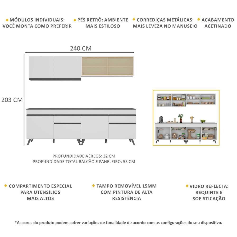 O Armário de Cozinha Compacta 240cm Veneza Multimóveis V3696 tem um excelente custo benefício e um amplo espaço interno. Produzido em MDP com acabamento acetinado (cerca de 20% de brilho), que garante maior durabilidade e resistência, possui corrediças metálicas (mais leveza no manuseio), pés retrô em polipropileno, que deixam o ambiente mais estiloso, puxadores em ABS e tampo em MDP 15mm com pintura de alta resistência. Os módulos são individuais e você pode montar da maneira que se adaptar melhor ao seu ambiente. O balcão possui tampo removível (compatível com pia de 120 cm). Para deixar sua cozinha mais bonita e organizada, possui vidro reflecta e compartimento especial para utensílios mais altos. Conteúdo da Embalagem: 1 (um) armário aéreo com portas de vidro 120cm 1 (um) armário aéreo 120cm 2 (dois) balcões com tampo 120cm Dimensões do produto montado: Cozinha - Altura: 203cm | Largura: 240cm | Profundidade: 32cm (aéreos) - 53cm (balcão com tampo) *Você pode consultar as medidas internas na imagem técnica do produto. *As cores do produto podem sofrer variações de tonalidade de acordo com as configurações do seu dispositivo. Imagem meramente ilustrativa. Decoração e eletros não acompanham o produto. O produto será entregue desmontado e não disponibilizamos o serviço de montagem.