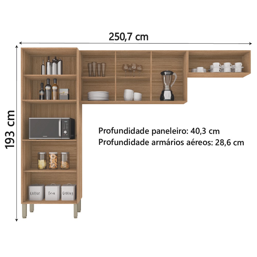 O Armário de Cozinha Versalhes amplo e versátil veio para garantir praticidade em seu dia a dia! Conta com 9 portas sendo 2 portas superiores com vidro espelhado, prateleiras bem divididas para melhor aproveitamento do espaço além de um espaço para acomodar forno micro-ondas e demais aparelhos de utilidade doméstica. Possui pés em plástico resistente que não agridem o piso. Ideal para quem busca praticidade em seu dia a dia. MEDIDAS: [ A ] = 193 cm [ L ] = 250,7 cm [ P ] = 40,3 cm MEDIDA PANELEIRO: [ A ] = 193 cm / [ L ] = 60,8 cm / [ P ] = 40,3 cm MEDIDA ARMÁRIO SUSPENSO: [ A ] = 60 cm / [ L ] = 120 cm / [ P ] = 28,6 cm MEDIDA ARMÁRIO GELADEIRA: [ A ] = 26,8 cm / [ L ] = 69,9 cm / [ P ] = 28,6 cm ALTURA DOS PÉS: 17 cm PESO: 55,1kg PESO SUPORTADO: 35 kg PANELEIRO SUPORTAM ATÉ: 15kg ARMÁRIO AÉREO SUPORTAM ATÉ: 12kg ARMÁRIO AÉREO GELADEIRA ATÉ: 8kg MODELO: Armário de Cozinha Compacta 9 Portas 2,50m Versalhes Kit's Paraná MARCA: Kit's Paraná ACABAMENTO: Pintura UV Fosco MATERIAL DA ESTRUTURA: MDP ESPESSURA DO MATERIAL: 12mm e 15mm PORTAS: 9 TIPO DE PORTA: Bater POSSUI VIDRO: Sim DOBRADIÇAS: Metálicas PRATELEIRAS: 3 MATERIAL DOS PUXADORES: Plástico QUANTIDADE DE PUXADORES: 9 PÉS: 4 MATERIAL DOS PÉS: Plástico DIFERENCIAL: Puxadores ergonômicos, corrediças telescópicas e pés reguláveis. GARANTIA: 3 Meses OBS: Não acompanha balcão ITENS INCLUSOS: Armário de Cozinha Compacta, 1 Manual de Montagem e 1 Kit parafusos A Esplanada Móveis se responsabiliza pela entrega dos produtos adquiridos até a porta de entrada ou portaria do endereço indicado, se a portaria do condomínio permitir, as entregas são efetuadas no piso térreo e é de responsabilidade do cliente a locomoção da mercadoria até seu apartamento ou casa. Confira as dimensões do produto e certifique-se de que estão adequadas aos elevadores, portas e corredores do local da entrega. Não fazemos a montagem, desmontagem do produto e/ou portas e janelas, transporte pela escada ou içamento pelo lado de fora do prédio. Não está incluso no serviço de entrega o deslocamento até o interior do apartamento, com ou sem elevador, ou deslocamento em locais de difícil acesso como escadarias.