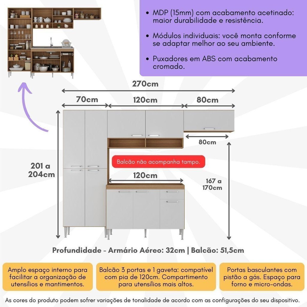Produzido em MDP de 15mm o Armário de Cozinha Compacta Paris Multimóveis é uma solução prática e elegante para o seu ambiente. O acabamento acetinado, com cerca de 20% de brilho, confere um toque de sofisticação. Este conjunto inclui um paneleiro com 4 portas, destacando-se pelos puxadores em ABS com acabamento cromado, que oferecem praticidade e durabilidade no uso diário. Além disso, um balcão compatível com pia de 120cm que conta com uma gaveta equipada com corrediças telescópicas, proporcionando um deslizamento suave e silencioso para facilitar o acesso aos utensílios. O armário aéreo de 120cm é projetado com nichos na parte inferior, proporcionando espaço conveniente para armazenar utensílios menores, como temperos, mantendo tudo organizado e ao alcance das mãos. Já o armário aéreo de 80cm vem equipado com uma porta basculante, que conta com pistão a gás para uma abertura suave e fácil acesso ao interior. Os pés em polipropileno, com ajuste de altura, asseguram estabilidade em variados tipos de superfície, proporcionando segurança e equilíbrio. O espaço interno de todos os módulos oferece capacidade de armazenamento adequada para seus utensílios, ingredientes e acessórios de cozinha, mantendo tudo organizado e ao seu alcance. Os módulos são individuais e permitem montagem conforme a necessidade do ambiente. Conteúdo da Embalagem: 1 (um) Paneleiro 70cm 1 (um) Balcão 120cm sem tampo 1 (um) Armário Aéreo 120cm 1 (um) Armário Aéreo 80cm Manual de Montagem Kit Ferragem Dimensões do produto montado: Altura: 204cm | Largura: 270cm | Profundidade: 51,5cm Espaço do nicho para fogão/geladeira: Altura: 170cm | Largura: 80cm *Você pode consultar as medidas detalhadas na imagem técnica do produto. *As cores do produto podem sofrer variações de tonalidade de acordo com as configurações do seu dispositivo. Imagem meramente ilustrativa. Decoração não acompanha o produto. O produto será entregue desmontado e não disponibilizamos o serviço de montagem.