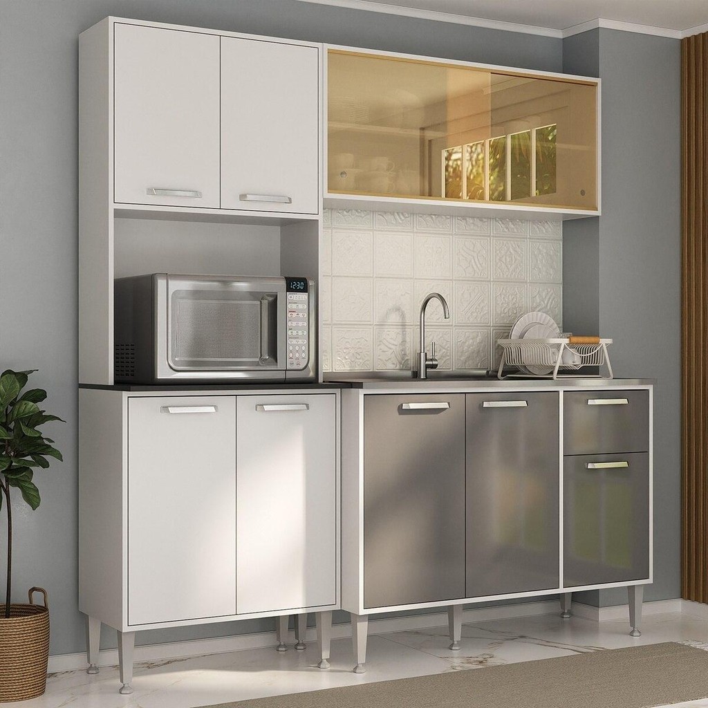 O Armário de Cozinha Compacta com Balcão para Pia Siena Multimóveis MP2217 é produzido em MDP 15mm com acabamento acetinado (cerca de 20% de brilho), garantindo durabilidade e resistência necessárias para a sua utilização diária. São 3 módulos separados que possibilitam a montagem de acordo com o espaço disponível no ambiente. Com 7 portas de dobradiças metálicas, 2 portas de correr em vidro reflecta e 1 gaveta com corrediças telescópicas (proporcionam um deslizamento suave e silencioso), possui amplo espaço interno para armazenar todos os seus itens de cozinha de forma organizada e acessível. Para adicionar ainda mais funcionalidade, a cozinha possui espaço para colocação de Micro-ondas. Os puxadores em ABS e os pés em polipropileno com regulagem de altura proporcionam estilo e estabilidade. As portas e a gaveta são embutidas no móvel, oferecendo um visual de cozinha planejada. O balcão possui tampo removível (compatível com pia de 105cm), trazendo praticidade e versatilidade para o seu espaço. Conteúdo da Embalagem: 1 (um) Armário Aéreo com Portas de Vidro 105cm 1 (uma) Armário para Micro-ondas 63cm 1 (um) Balcão com Tampo 105cm Manual de Montagem Kit Ferragem Dimensões do produto montado: Armário Aéreo - Altura: 45cm | Largura: 105cm | Profundidade: 27cm Armário para Micro-ondas: Altura: 191cm | Largura: 63cm | Profundidade: 27cm Balcão - Altura: 88cm | Largura: 105cm | Profundidade: 52cm *Você pode consultar as medidas detalhadas na imagem técnica do produto. *As cores do produto podem sofrer variações de tonalidade de acordo com as configurações do seu dispositivo. Imagem meramente ilustrativa. Decoração, eletros epia não acompanham o produto. O produto será entregue desmontado e não disponibilizamos o serviço de montagem.
