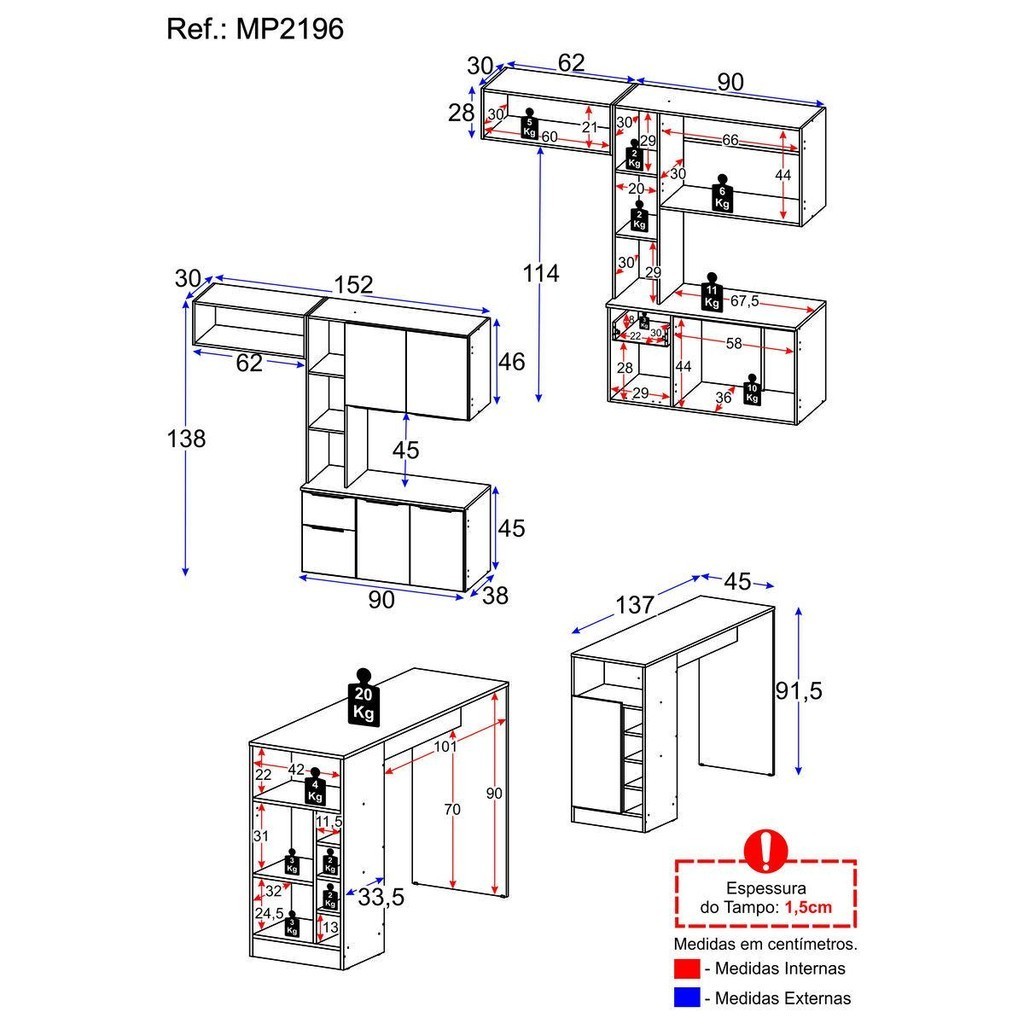 O Armário de Cozinha Compacta com Bancada Americana Sofia Multimóveis MP2196 é a solução ideal para quem busca praticidade e elegância no espaço culinário. Produzido em MDP com acabamento acetinado (cerca de 20% de brilho), garante durabilidade. Com 5 portas (sendo a menor basculante), prateleiras e 1 gaveta com corrediças metálicas (mais leveza no manuseio), a cozinha possui amplo espaço interno para armazenar itens e manter tudo organizado na hora de preparar suas receitas. Os puxadores em ABS são modernos e agregam um toque de estilo ao ambiente. Além disso, os tampos de 15mm da bancada (suporta até 20kg) e do balcão (suporta até 11kg) são resistentes. Vale destacar que este balcão NÃO é indicado para utilização de pia. Por ser uma cozinha suspensa (sem pés), permite ajustar a altura para encaixar a geladeira ou fogão conforme sua preferência. O nicho aéreo é individual, possibilitando a montagem em ambos os lados, oferecendo flexibilidade na montagem. A bancada conta com 1 porta, prateleira interna e adega embutida, o que facilita na hora de servir bebidas às suas visitas, além de poder ser utilizada também como divisora de ambientes. Conteúdo da Embalagem: 1 (um) Armário com Balcão e Nicho 1 (uma) Bancada/Mesa Manual de Montagem Kit Ferragem Dimensões do produto montado: Cozinha - Altura: 138cm | Largura: 152cm | Profundidade: 38cm Bancada/Mesa - Altura: 91,5cm | Largura: 137cm | Profundidade: 45cm Espaço para Fogão/Geladeira: Altura: Ajustável | Largura: 62cm *Você pode consultar as medidas detalhadas na imagem técnica do produto. *As cores do produto podem sofrer variações de tonalidade de acordo com as configurações do seu dispositivo. Imagem meramente ilustrativa. Decoração e eletros não acompanham o produto. O produto será entregue desmontado e não disponibilizamos o serviço de montagem.