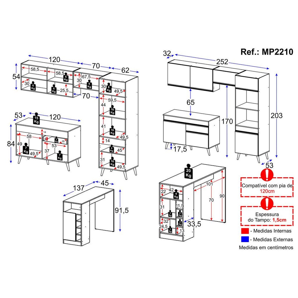 O Armário de Cozinha Compacta com Mesa/Bancada Veneza Multimóveis MP2210 é produzido em MDP com acabamento acetinado (cerca de 20% de brilho), oferecendo durabilidade e um toque sofisticado. Com 7 portas, sendo 3 basculantes, 1 gaveta com corrediças metálicas (mais leveza no manuseio) e módulo para forno e micro-ondas, a cozinha proporciona amplo espaço de armazenamento. Além disso, conta com espaço para colocação de fogão ou geladeira, deixando sua cozinha ainda mais completa. Os pés retrô em polipropileno e os puxadores em ABS adicionam charme ao design. Os tampos do balcão (suporta até 15kg) e da bancada (suporta até 20kg), ambos de 15mm, garantem resistência. Os módulos são individuais, permitindo a montagem de acordo com o espaço disponível. Versátil, o balcão possui tampo removível (compatível com pia de 120cm) e compartimento especial para utensílios mais altos. A bancada inclusa conta com 1 porta, prateleira interna e adega embutida, permitindo acomodar bebidas e itens mais utilizados no dia a dia, além de poder ser utilizada como divisora de ambientes. Este conjunto é uma ótima opção para agregar beleza e funcionalidade no seu lar! Conteúdo da Embalagem: 1 (um) Armário Aéreo 70cm 1 (um) Armário Aéreo 120cm 1 (um) Balcão com Tampo 120cm 1 (um) Armário para Forno e Micro-Ondas 62cm 1 (uma) Bancada/Mesa Manual de Montagem Kit Ferragem Dimensões do produto montado: Cozinha - Altura: 203cm | Largura: 252cm | Profundidade: 53cm Bancada/Mesa - Altura: 91,5cm | Largura: 137cm | Profundidade: 45cm Espaço para Fogão/Geladeira - Altura: 170cm | Largura: 70cm *Você pode consultar as medidas detalhadas na imagem técnica do produto. *As cores do produto podem sofrer variações de tonalidade de acordo com as configurações do seu dispositivo. Imagem meramente ilustrativa. Decoração e eletros não acompanham o produto. O produto será entregue desmontado e não disponibilizamos o serviço de montagem.