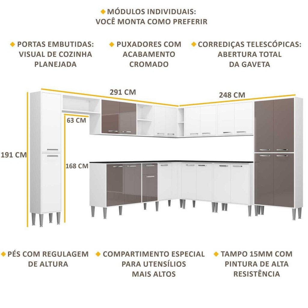 A Cozinha Completa com Armário e Balcão com Tampo 11 peças Xangai Pop Multimóveis tem um excelente custo benefício e um amplo espaço interno. Os módulos são individuais e você pode montar da maneira que se adaptar melhor ao seu ambiente. Produzida em MDP, que garante maior durabilidade e resistência, conta com corrediças telescópicas em aço (maior durabilidade e travas de segurança para evitar acidentes), pés com regulagem de altura (permitem um perfeito nivelamento dos módulos), puxadores em ABS com acabamento cromado e tampos em MDP 15mm com pintura de alta resistência. Para deixar sua cozinha mais bonita e organizada, possui compartimento especial para utensílios mais altos e módulo aéreo com nichos. As portas embutidas proporcionam um visual de cozinha planejada. Conteúdo da Embalagem: 1 (um) nicho horizontal 1 (um) armário aéreo de 105 cm 1 (um) paneleiro duplo 1 (um) balcão com tampo de 105 cm 1 (um) balcão com tampo de canto 1 (um) armário aéreo de canto 1 (um) paneleiro simples 2 (dois) balcões com tampo de 70 cm cada 2 (dois) armários aéreos de 70 cm cada Kit Ferragem Manual de Montagem Dimensões do Produto Montado: Altura: 191 cm / Largura: 291 x 248 cm / Profundidade: 27,5 cm (aéreos e paneleiro) - 45 cm (balcão com tampo) / Espaço do nicho para fogão/geladeira: Altura: 168 cm - Largura: 63 cm *Você pode consultar as medidas internas na imagem técnica do produto. *As cores do produto podem sofrer variações de tonalidade de acordo com as configurações do seu dispositivo. Imagem meramente ilustrativa. Decoração e eletros não acompanham o produto. O produto será entregue desmontado e a Multimóveis não disponibiliza o serviço de montagem.