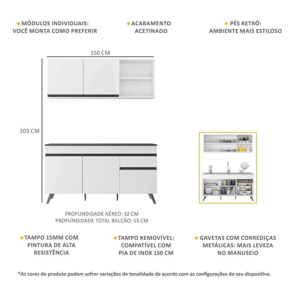 A Cozinha Compacta Veneza Multimóveis MP2079 com Armário e Balcão tem um excelente custo benefício e um amplo espaço interno. Produzida em MDP com acabamento acetinado (cerca de 20% de brilho), que garante maior durabilidade e resistência, possui corrediças metálicas (mais leveza no manuseio), pés retrô em polipropileno, que deixam o ambiente mais estiloso, puxadores em ABS e tampo em MDP 15mm com pintura de alta resistência. Esta cozinha conta com balcão com tampo removível (compatível com pia de 150 cm) com 1 gaveta e 3 portas. *Não acompanha pia de inox. Conteúdo da Embalagem: 1 (um) armário aéreo 150cm 1 (um) balcão com tampo 150cm Dimensões do produto montado: Altura: 203cm | Largura: 150cm | Profundidade: 32cm (aéreo) - 53cm (balcão com tampo) *Você pode consultar as medidas internas na imagem técnica do produto. Disponível nas cores: Branco - Preto Acetinado Texturizado *As cores do produto podem sofrer variações de tonalidade de acordo com as configurações do seu dispositivo. Imagem meramente ilustrativa. Decoração e eletros não acompanham o produto. O produto será entregue desmontado e a não disponibilizamos o serviço de montagem.