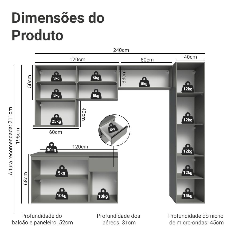 A Cozinha Completa de 240 cm oferece mais espaço de armazenamento e praticidade. Além do aéreo para micro-ondas, ela conta com um paneleiro de duas portas. Com a opção de ser instalada de forma suspensa, essa cozinha oferece um visual moderno. O acabamento se destaca por sua tonalidade sofisticada e atemporal, transmite modernidade. O balcão possui dobradiças metálicas nas portas e puxadores em perfil de alumínio, garantindo resistência. As gavetas possuem corrediças que permitem abertura total, oferecendo mais praticidade. O tampo é removível, possibilitando a instalação de cuba ou pedra e o acabamento é de alta resistência, garantindo durabilidade. Medidas totais: - 211 cm de altura - 240 cm de largura - 52 cm de profundidade no balcão e paneleiro, 31 cm nos aéreos e 45 cm no nicho para micro-ondas O que você recebe: - Um Armário Aéreo de 120 cm com duas portas - Um Nicho aéreo de 60 cm com espaço para forno - Um Armário Aéreo de 80 cm com uma porta basculante - Um Balcão de 120 cm com três portas e uma gaveta - Um Paneleiro de 40 cm com duas portas Código do produto: XMGRNC2400093B XMGRNC2400097P É importante saber: - Material: MDP - O produto não possui pés, deve ser instalado de forma suspensa. - Imagens meramente ilustrativas, a decoração não acompanha o produto. - A Madesa não oferece serviço de montagem. - O produto segue com manual e todas as ferragens necessárias. - Por segurança, o paneleiro deve ser fixado na parece. A Madesa possui compromisso com a sustentabilidade. Geramos energia limpa em nossa própria usina, priorizamos fornecedores responsáveis e utilizamos plástico reciclado em nossa produção. Além disso, reinserimos sobras no ciclo de reciclagem e investimos no desenvolvimento de nossos colaboradores e da comunidade. Garantia: Este produto conta com 1 ano de garantia total, sendo 3 meses de garantia legal e 9 meses de garantia contratual. A garantia cobre exclusivamente defeitos de fabricação e vícios ocultos. Não estão cobertos: problemas decorrentes de montagem incorreta, uso inadequado, exposição à umidade, calor ou luz solar direta, modificações no produto ou desgaste natural.