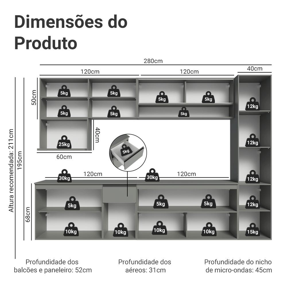 Armário de Cozinha Completa 280 cm Suspensa Cinza Nice Madesa 04