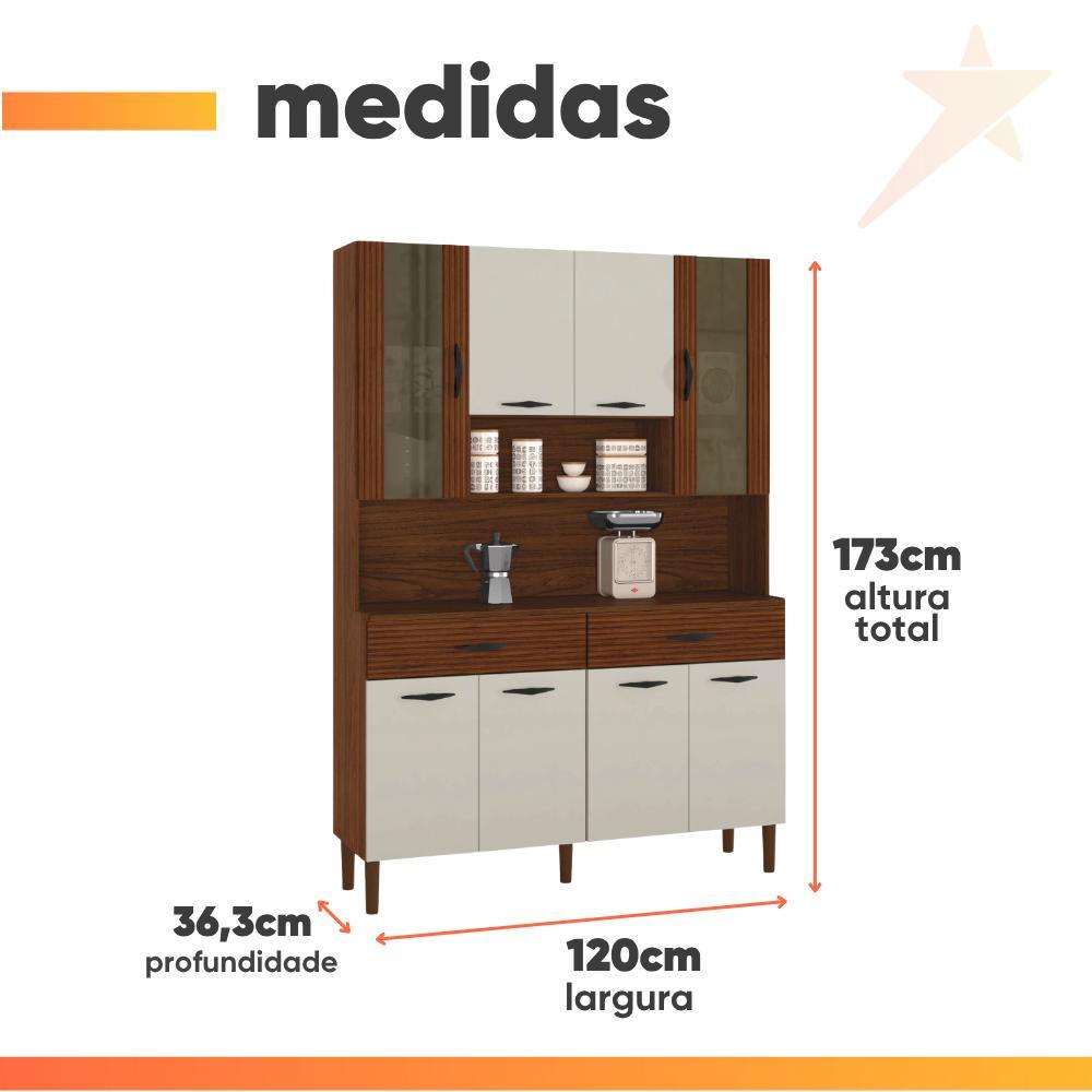 Uma cozinha completa, moderna e cheia de estilo para deixar sua casa de cara nova. O Armário de Cozinha Golden conta com 8 portas sendo 2 portas superiores com vidro temperado deixando seu ambiente ainda mais moderno, 2 gavetas espaçosas, e excelente aproveitamento no espaço interno, com prateleiras e nichos para pequenos objetos ou decoração. Além de contar com pés resistente que não agridem o piso Combinação perfeita de beleza, resistência e durabilidade. MEDIDAS DO PRODUTO: [ A ] = 173 cm [ L ] = 120 cm [ P ] = 36,3 cm (Inferior) / 25,1 cm (Superior) MEDIDA DO NICHO: [ A ] = 20,5 cm [ L ] = 58,2 cm [ P ] = 24,3 cm PESO: 44,45kg ALTURA DOS PÉS: 14,5 cm PESO SUPORTADO: 17 kg PRATELEIRAS SUPORTAM ATÉ: 12 kg GAVETA SUPORTA ATÉ: 4 kg MODELO: Armário de Cozinha Completa 8 Portas 2 Gaveta Golden Kit's Paraná MARCA: Kit's Paraná COR: Nogueira / Off White ACABAMENTO: Pintura UV Fosco MATERIAL DA ESTRUTURA: MDP ESPESSURA DO MATERIAL: 12mm e 15mm PORTAS: 8 TIPO DE PORTA: Bater POSSUI ESPELHO: Sim DOBRADIÇAS: Metálicas PRATELEIRAS: 1 GAVETAS: 2 CORREDIÇAS: Metálicas POSSUI NICHO: Sim POSSUI TAMPO: Sim MATERIAL DO TAMPO: MDP MATERIAL DOS PUXADORES: Plástico PÉS: 5 MATERIAL DOS PÉS: Plástico GARANTIA: 3 Meses A Esplanada Móveis se responsabiliza pela entrega dos produtos adquiridos até a porta de entrada ou portaria do endereço indicado, se a portaria do condomínio permitir, as entregas são efetuadas no piso térreo e é de responsabilidade do cliente a locomoção da mercadoria até seu apartamento ou casa. Confira as dimensões do produto e certifique-se de que estão adequadas aos elevadores, portas e corredores do local da entrega. Não fazemos a montagem, desmontagem do produto e/ou portas e janelas, transporte pela escada ou içamento pelo lado de fora do prédio. Não está incluso no serviço de entrega o deslocamento até o interior do apartamento, com ou sem elevador, ou deslocamento em locais de difícil acesso como escadarias.