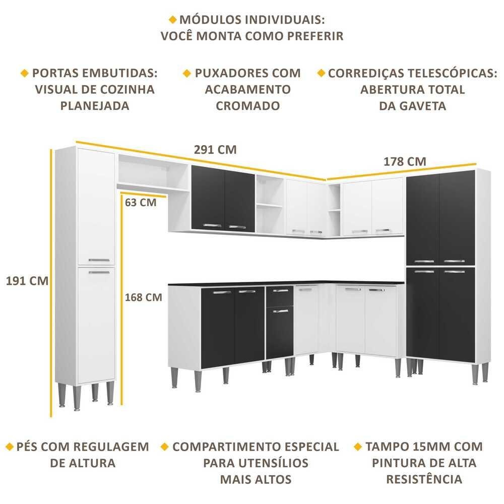 O Armário de Cozinha Completa 9 peças Xangai Rock Multimóveis tem um excelente custo benefício e um amplo espaço interno. Os módulos são individuais e você pode montar da maneira que se adaptar melhor ao seu ambiente. Produzida em MDP, que garante maior durabilidade e resistência, conta com corrediças telescópicas em aço (maior durabilidade e travas de segurança para evitar acidentes), pés com regulagem de altura (permitem um perfeito nivelamento dos módulos), puxadores em ABS com acabamento cromado e tampos em MDP 15mm com pintura de alta resistência. Para deixar sua cozinha mais bonita e organizada, possui compartimento especial para utensílios mais altos e módulo aéreo com nichos. As portas embutidas proporcionam um visual de cozinha planejada. Conteúdo da Embalagem: 1 (um) nicho horizontal 1 (um) armário aéreo de 105 cm 1 (um) paneleiro duplo 1 (um) balcão com tampo de 105 cm 1 (um) balcão com tampo de canto 1 (um) armário aéreo de canto 1 (um) paneleiro simples 1 (um) balcão com tampo de 70 cm 1 (um) armário aéreo de 70 cm Dimensões do produto montado: Cozinha: Altura: 191 cm - Largura: 321 x 148 cm - Profundidade: 27,5 cm (aéreos e paneleiro) - 45 cm (balcão com tampo) Espaço do nicho para fogão/geladeira: Altura: 168 cm - Largura: 63 cm *Você pode consultar as medidas internas na imagem técnica do produto. *As cores do produto podem sofrer variações de tonalidade de acordo com as configurações do seu dispositivo. Imagem meramente ilustrativa. Decoração e eletros não acompanham o produto. O produto será entregue desmontado e não disponibilizamos o serviço de montagem.