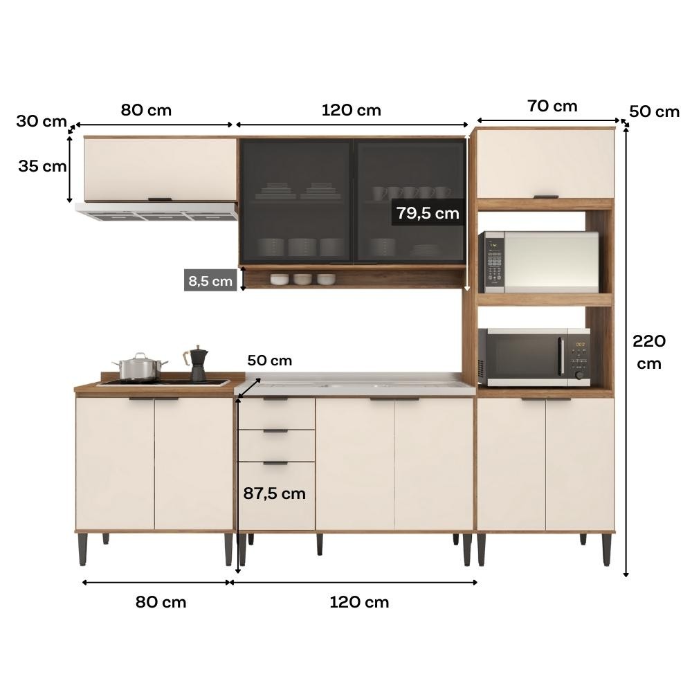 Armário de Cozinha Completa c Balcão Miami Studio Carraro Off White c Freijó