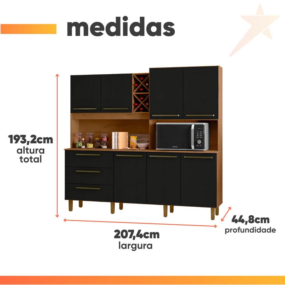 Armário de Cozinha Completa Com Adega 7 Portas 3 Gavetas 2,07m Ajax Nature / Preto Zanzini