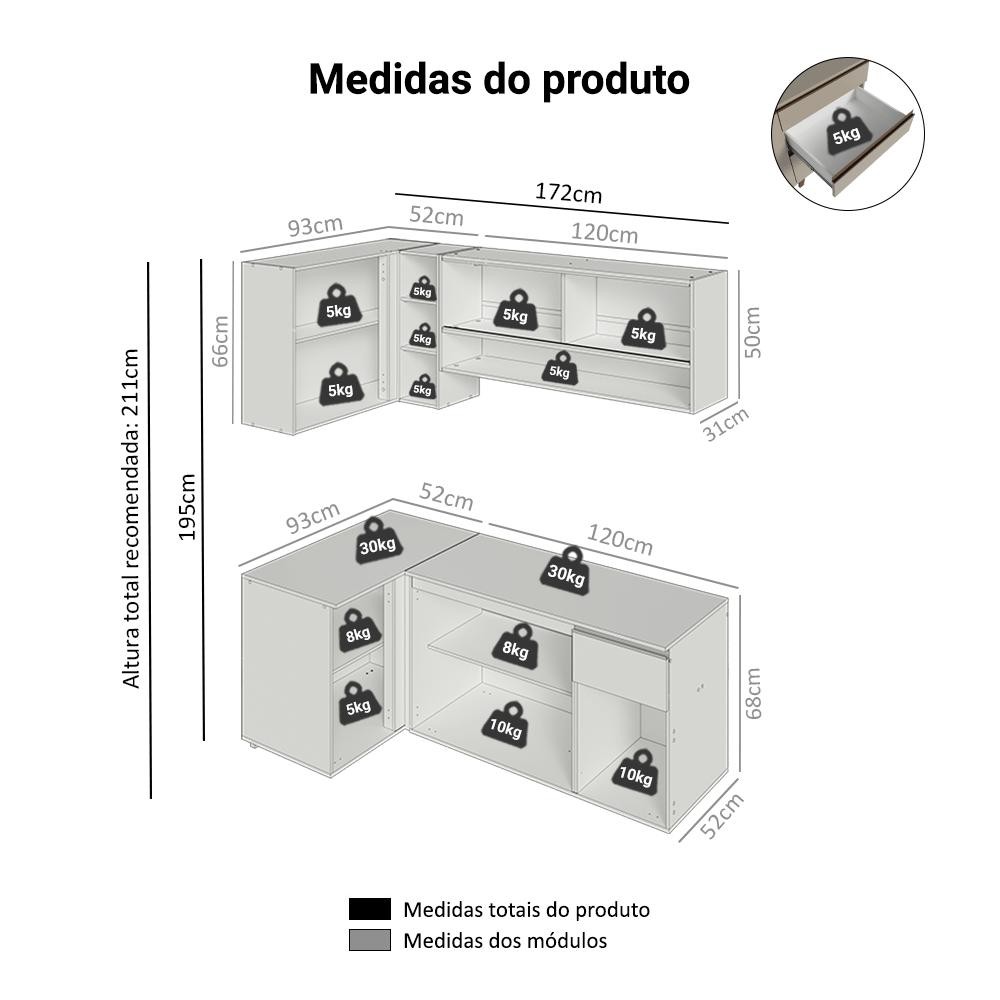 Armário de Cozinha Completa de Canto 265 cm Suspenso Crema Nice Madesa 04
