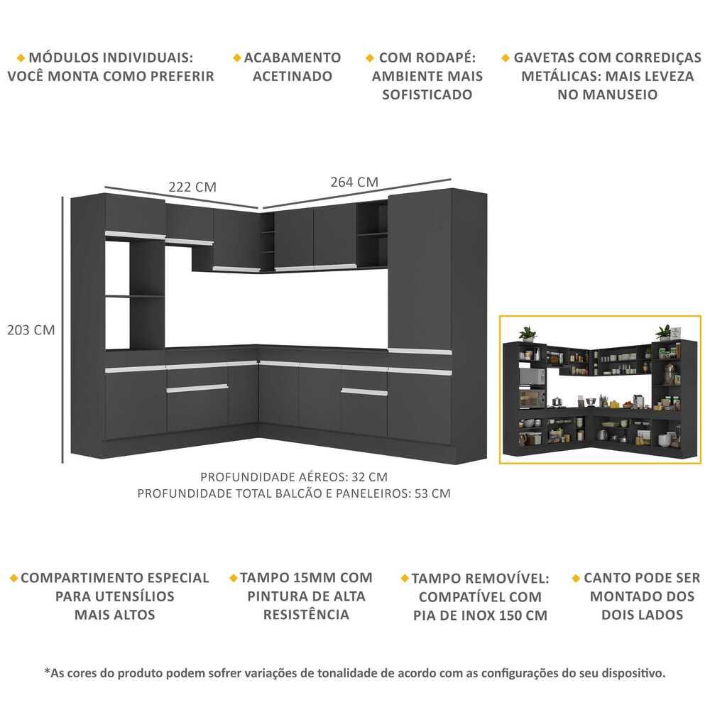 Armário de Cozinha Completa de Canto com Rodapé Veneza Multimóveis MP2081.898 Preto/Branco