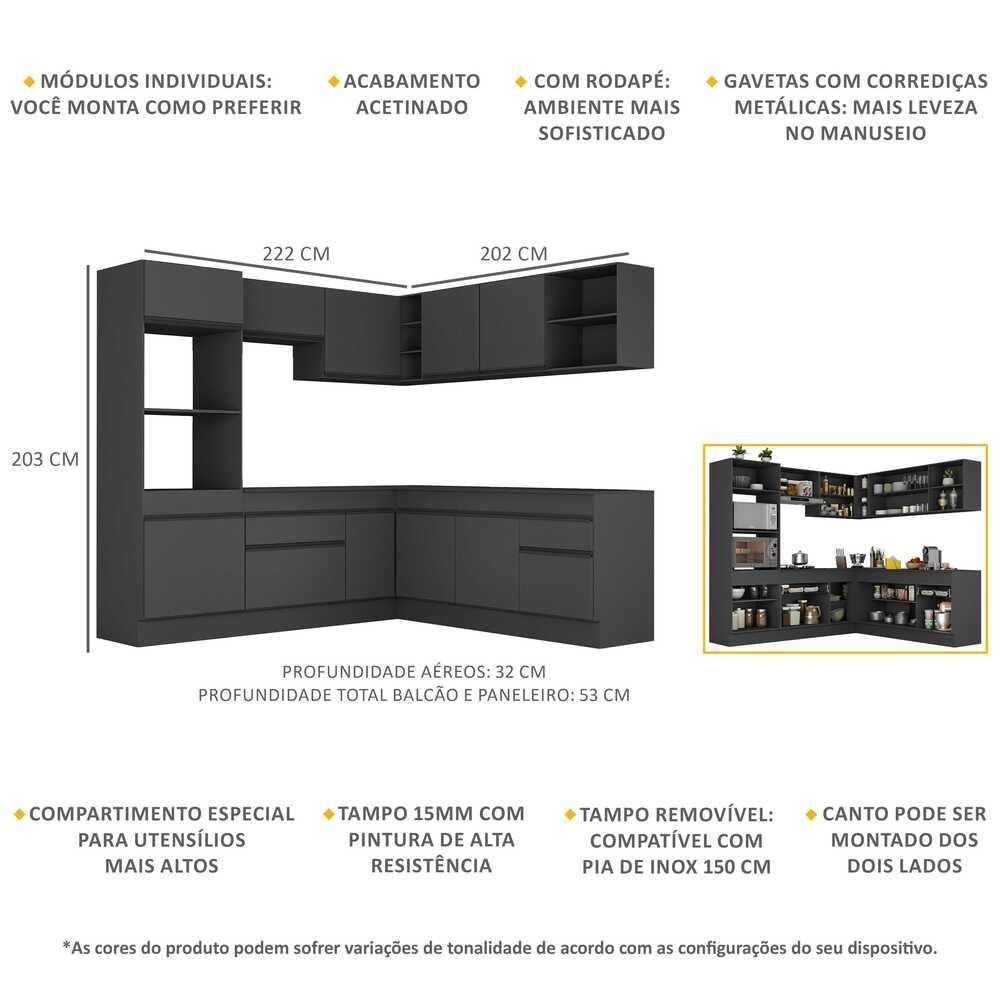 O Armário de Cozinha Completa de Canto com Rodapé Veneza Multimóveis V2080 tem um excelente custo benefício e um amplo espaço interno. Produzido em MDP com acabamento acetinado (cerca de 20% de brilho), que garante maior durabilidade e resistência, possui corrediças metálicas (mais leveza no manuseio), rodapés, que deixam o ambiente mais estiloso, puxadores em ABS e tampo em MDP 15mm com pintura de alta resistência. Os módulos de canto podem ser montados dos dois lados (esquerdo ou direito), conforme a sua referência. Esta cozinha conta, ainda, com balcão com tampo removível (compatível com pia de 150 cm), com 1 gaveta e 3 portas e balcão para cooktop (o recorte do tampo deve ser realizado na hora da montagem conforme a medida do seu fogão) com 1 gaveta e 1 porta. Os módulos são individuais e você pode montar da maneira que se adaptar melhor ao seu ambiente. Conteúdo da Embalagem: 1 (um) armário para forno e microondas 62cm 1 (um) armário aéreo 70cm 1 (um) armário aéreo de canto 90cm 1 (um) armário aéreo 150cm 1 (um) balcão com tampo 70cm 1 (um) balcão com tampo de canto 90cm 1 (um) balcão com tampo 150cm 1 (um) kit com rodapés Dimensões do produto montado: Altura: 203cm | Largura: 222 x 202cm | Profundidade: 32cm (aéreos) - 53cm (balcão com tampo e paneleiro) *Você pode consultar as medidas internas na imagem técnica do produto. *As cores do produto podem sofrer variações de tonalidade de acordo com as configurações do seu dispositivo. Imagem meramente ilustrativa. Decoração e eletros não acompanham o produto. O produto será entregue desmontado e não disponibilizamos o serviço de montagem.