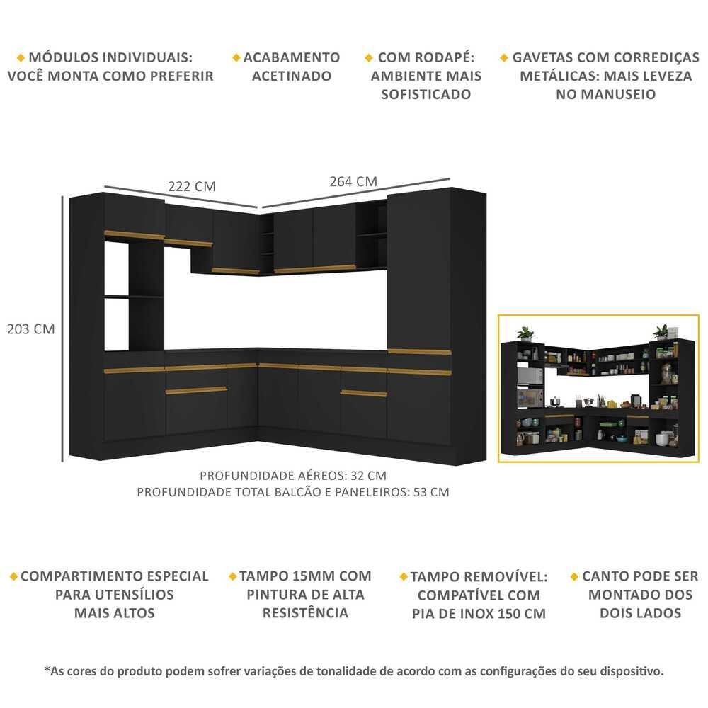 O Armário de Cozinha Completa de Canto com Rodapé Veneza Multimóveis V2081 tem um excelente custo benefício e um amplo espaço interno. Produzido em MDP com acabamento acetinado (cerca de 20% de brilho), que garante maior durabilidade e resistência, possui corrediças metálicas (mais leveza no manuseio), rodapés, que deixam o ambiente mais estiloso, puxadores em ABS e tampo em MDP 15mm com pintura de alta resistência. Os módulos de canto podem ser montados dos dois lados (esquerdo ou direito), conforme a sua preferência. Esta cozinha conta, ainda, com balcão com tampo removível (compatível com pia de 150 cm), com 1 gaveta e 3 portas e balcão para cooktop (o recorte do tampo deve ser realizado na hora da montagem conforme a medida do seu fogão) com 1 gaveta e 1 porta. Os módulos são individuais e você pode montar da maneira que se adaptar melhor ao seu ambiente. Conteúdo da Embalagem: 1 (um) armário para forno e microondas 62cm 1 (um) armário aéreo 70cm 1 (um) armário aéreo de canto 90cm 1 (um) armário aéreo 150cm 1 (um) balcão com tampo 70cm 1 (um) balcão com tampo de canto 90cm 1 (um) balcão com tampo 150cm 1 (um) paneleiro 62cm 1 (um) kit com rodapés Dimensões do produto montado: Altura: 203cm | Largura: 222 x 264cm | Profundidade: 32cm (aéreos) - 53cm (balcão com tampo e paneleiro) *Você pode consultar as medidas internas na imagem técnica do produto. *As cores do produto podem sofrer variações de tonalidade de acordo com as configurações do seu dispositivo. Imagem meramente ilustrativa. Decoração e eletros não acompanham o produto. O produto será entregue desmontado e não disponibilizamos o serviço de montagem.