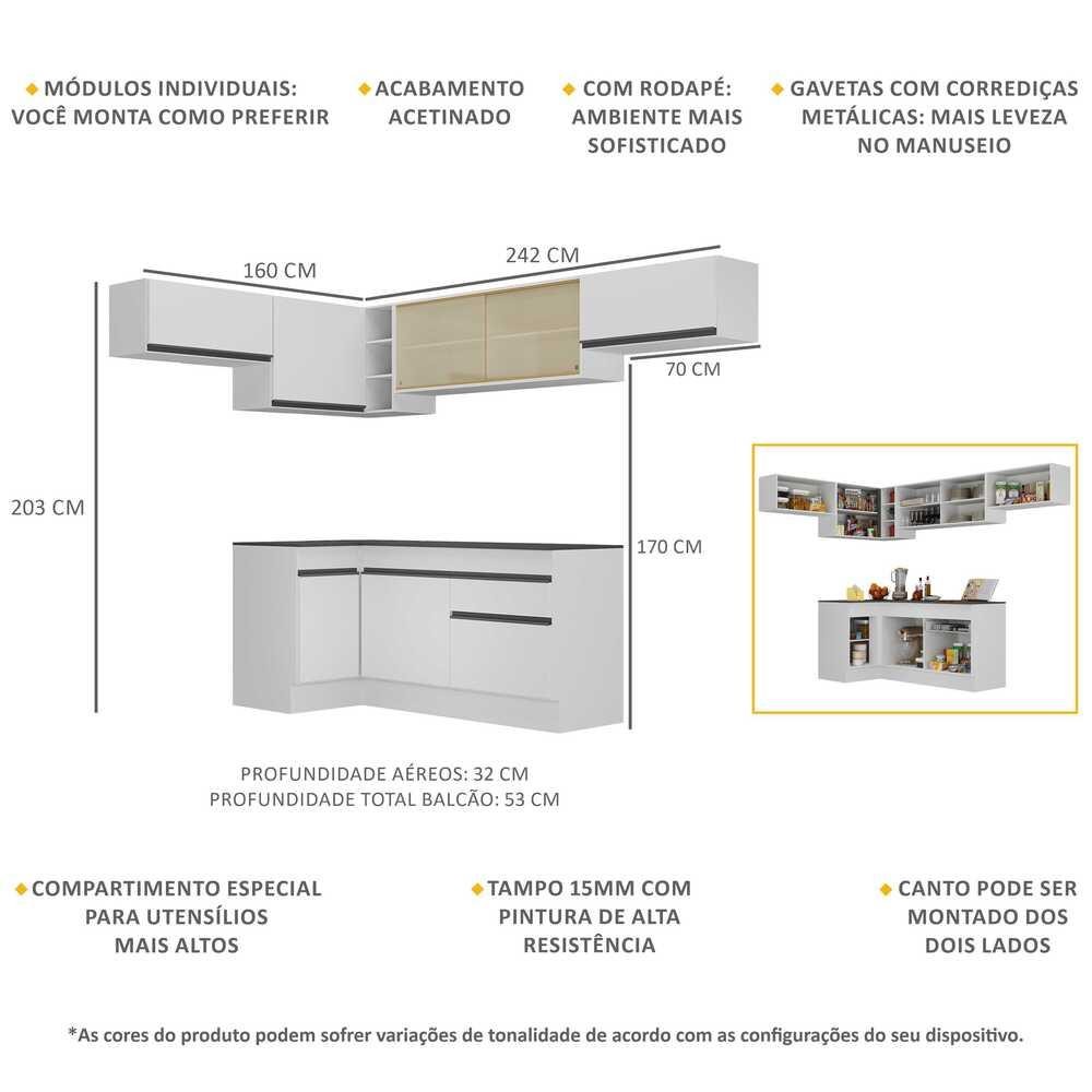 O Armário de Cozinha Completa de Canto com Rodapé Veneza Multimóveis V2095 tem um excelente custo benefício e um amplo espaço interno. Produzido em MDP com acabamento acetinado (cerca de 20% de brilho), que garante maior durabilidade e resistência, possui corrediças metálicas (mais leveza no manuseio), rodapés, que deixam o ambiente mais estiloso, puxadores em ABS e tampo em MDP 15mm com pintura de alta resistência. Os módulos de canto podem ser montados dos dois lados (esquerdo ou direito), conforme a sua preferência. Esta cozinha conta, ainda, com balcão com tampo removível (compatível com pia de 120 cm), com 1 gaveta e 2 portas. Os módulos são individuais e você pode montar da maneira que se adaptar melhor ao seu ambiente. Para deixar sua cozinha mais bonita e organizada, possui vidro reflecta e compartimento especial para utensílios mais altos. Conteúdo da Embalagem: 2 (dois) armários aéreos 70cm 1 (um) armário aéreo de canto 90cm 1 (um) armário aéreo com portas de vidro 120cm 1 (um) balcão com tampo de canto 90cm 1 (um) balcão com tampo 120cm 1 (um) kit com rodapés Dimensões do produto montado: Altura: 203cm | Largura: 160 x 242cm | Profundidade: 32cm (aéreos) - 53cm (balcão com tampo) *Você pode consultar as medidas internas na imagem técnica do produto. *As cores do produto podem sofrer variações de tonalidade de acordo com as configurações do seu dispositivo. Imagem meramente ilustrativa. Decoração e eletros não acompanham o produto. O produto será entregue desmontado e não disponibilizamos o serviço de montagem.