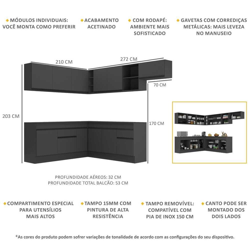 O Armário de Cozinha Completa de Canto com Rodapé Veneza Multimóveis V2103 tem um excelente custo benefício e um amplo espaço interno. Produzido em MDP com acabamento acetinado (cerca de 20% de brilho), que garante maior durabilidade e resistência, possui corrediças metálicas (mais leveza no manuseio), rodapés, que deixam o ambiente mais estiloso, puxadores em ABS e tampo em MDP 15mm com pintura de alta resistência. Os módulos de canto podem ser montados dos dois lados (esquerdo ou direito), conforme a sua preferência. Esta cozinha conta, ainda, com balcão com tampo removível (compatível com pia de 120 ou 150 cm). Os módulos são individuais e você pode montar da maneira que se adaptar melhor ao seu ambiente. Conteúdo da Embalagem: 1 (um) armário aéreo 120cm 1 (um) armário aéreo de canto 90cm 1 (um) armário aéreo 150cm 1 (um) armário aéreo 70cm 1 (um) balcão com tampo 120cm 1 (um) balcão com tampo de canto 90cm 1 (um) balcão com tampo 150cm 1 (um) kit com rodapés Dimensões do produto montado: Altura: 203cm | Largura: 210 x 272cm | Profundidade: 32cm (aéreos) - 53cm (balcão com tampo) *Você pode consultar as medidas internas na imagem técnica do produto. *As cores do produto podem sofrer variações de tonalidade de acordo com as configurações do seu dispositivo. Imagem meramente ilustrativa. Decoração e eletros não acompanham o produto. O produto será entregue desmontado e não disponibilizamos o serviço de montagem.