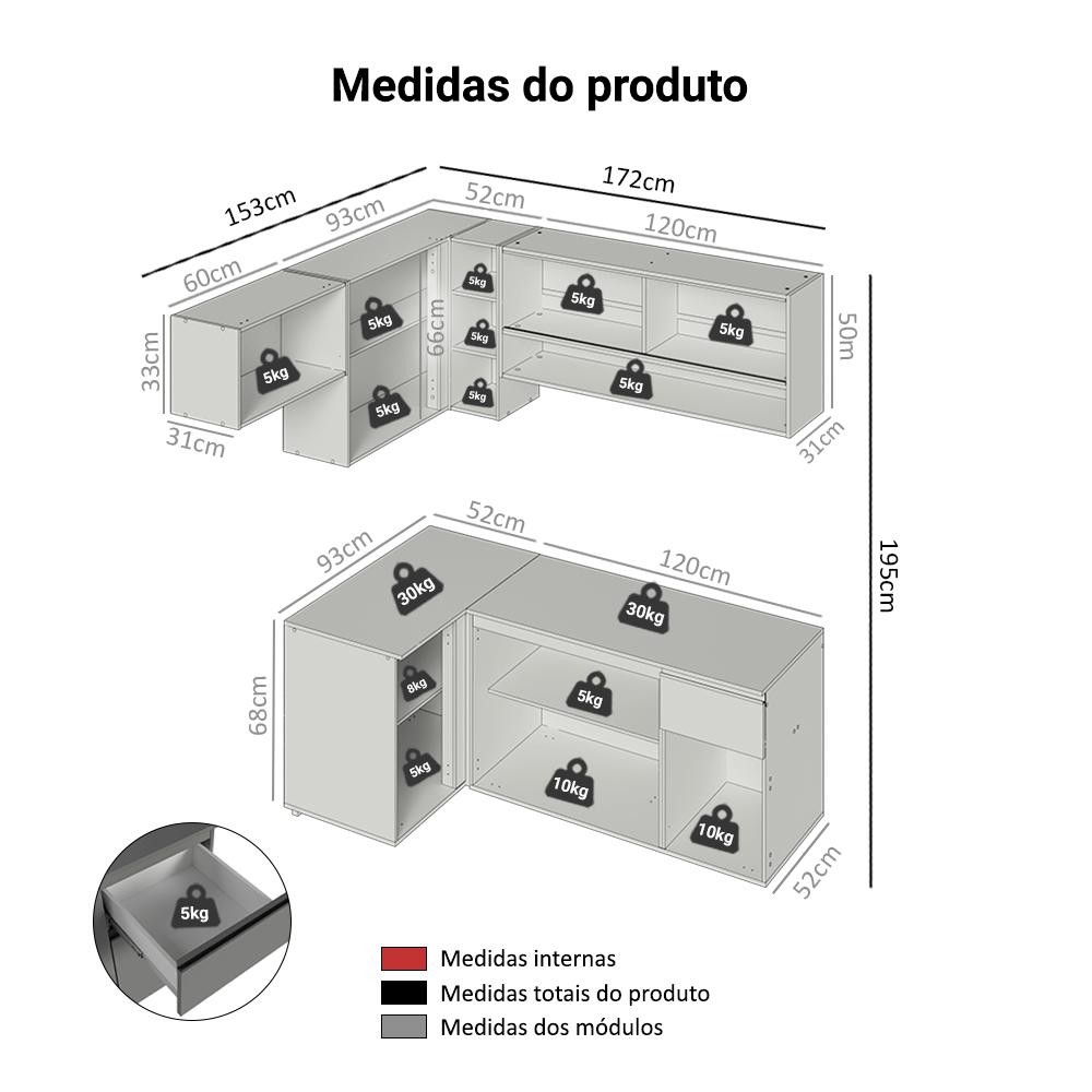 O Armário de Canto Nice Madesa é perfeito para organizar todos os utensílios e louças da sua cozinha. Super moderno e com formato suspenso, o móvel facilita a limpeza e traz um toque de elegância. Fabricado com itens de qualidade superior, conta com portas com dobradiças metálicas, gaveta com corrediça telescópica, puxadores de alumínio e vidros no estilo pontilhado. Para completar, o acabamento cinza de alta resistência do móvel segue tendências atuais de decoração. Medidas: - 195 cm de altura - 325 cm de largura - 52 cm de profundidade nos balcões e 31 cm nos aéreos O que você recebe: - Um (1) Aéreo de 60 cm com uma porta basculante - Um (1) Aéreo de Canto com uma porta e adega acoplada - Um (1) Balcão de Canto com uma porta - Um (1) Aéreo de 120 cm com duas portas de correr de vidro e um nicho - Um (1) Balcão de 120 cm com três portas, uma gaveta tampo - Manual de montagem e ferragens Código do produto: GCNC3250013B É bom saber: - Imagens meramente ilustrativas - A Madesa não disponibiliza serviço de montagem - A cozinha não acompanha pés, deve ser instalada de forma suspensa, com fixação na parede - Material: MDP A Madesa possui compromisso com a sustentabilidade. Geramos energia limpa em nossa própria usina, priorizamos fornecedores responsáveis e utilizamos plástico reciclado em nossa produção. Além disso, reinserimos sobras no ciclo de reciclagem e investimos no desenvolvimento de nossos colaboradores e da comunidade. Garantia: Este produto conta com 1 ano de garantia total, sendo 3 meses de garantia legal e 9 meses de garantia contratual. A garantia cobre exclusivamente defeitos de fabricação e vícios ocultos. Não estão cobertos: problemas decorrentes de montagem incorreta, uso inadequado, exposição à umidade, calor ou luz solar direta, modificações no produto ou desgaste natural.