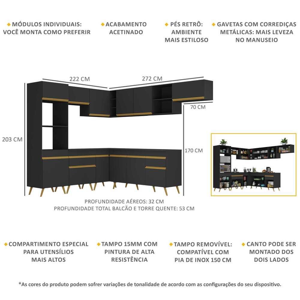 O Armário de Cozinha Completa de Canto Veneza Multimóveis V2048 tem um excelente custo benefício e um amplo espaço interno. Produzido em MDP com acabamento acetinado (cerca de 20% de brilho), que garante maior durabilidade e resistência, possui corrediças metálicas (mais leveza no manuseio), pés retrô em polipropileno, que deixam o ambiente mais estiloso, puxadores em ABS e tampo em MDP 15mm com pintura de alta resistência. Os módulos de canto podem ser montados dos dois lados (esquerdo ou direito), conforme a sua preferência. Esta cozinha conta, ainda, com balcão com tampo removível (compatível com pia de 150 cm), com 1 gaveta e 3 portas e balcão para cooktop (o recorte do tampo deve ser realizado na hora da montagem conforme a medida do seu fogão) com 1 gaveta e 1 porta. Os módulos são individuais e você pode montar da maneira que se adaptar melhor ao seu ambiente. Conteúdo da Embalagem: 1 (um) armário para forno e microondas 62cm 1 (um) armário aéreo 70cm 1 (um) armário aéreo de canto 90cm 1 (um) armário aéreo 150cm 1 (um) balcão com tampo 70cm 1 (um) balcão com tampo de canto 90cm 1 (um) balcão com tampo 150cm 1 (um) armário aéreo 70cm Dimensões do produto montado: Altura: 203cm | Largura: 222 x 272cm | Profundidade: 32cm (aéreos) - 53cm (balcão com tampo e paneleiro) *Você pode consultar as medidas internas na imagem técnica do produto. *As cores do produto podem sofrer variações de tonalidade de acordo com as configurações do seu dispositivo. Imagem meramente ilustrativa. Decoração e eletros não acompanham o produto. O produto será entregue desmontado e não disponibilizamos o serviço de montagem.