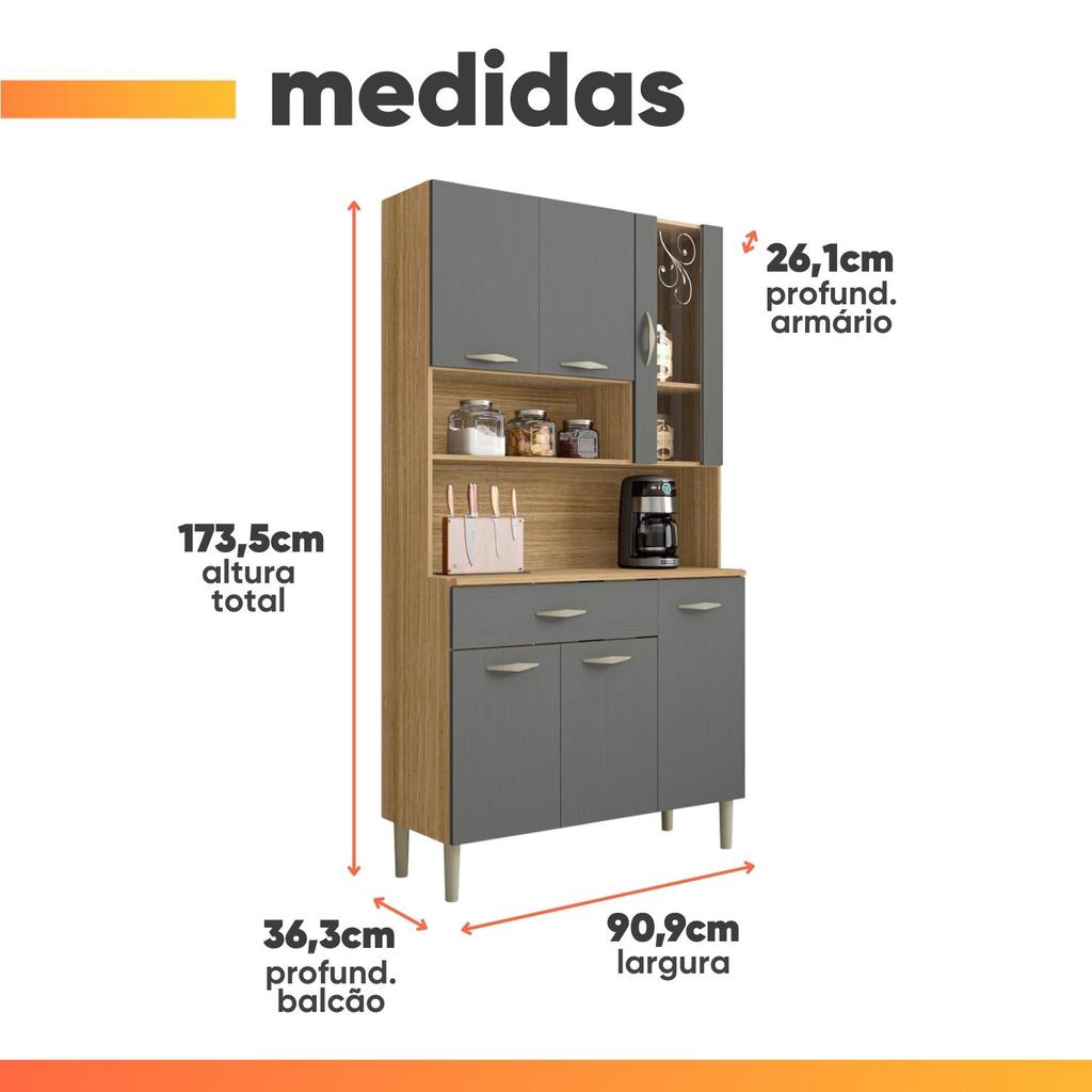 O Armário de Cozinha Golden tem tudo o que você precisa para manter a praticidade e beleza da sua cozinha ou área gourmet, possui 6 portas, sendo 1 delas cristaleira e 1 gaveta. Seus compartimentos internos possibilitam uma boa organização e distribuição dos objetos. Produzida com materiais de ótima qualidade, aumentando a durabilidade do produto. MEDIDAS: [ A ] = 173,5 cm [ L ] = 90,9 cm [ P ] = 26,1 cm (superior) / 36,3 cm (inferior) MEDIDAS DO NICHO MAIOR: A = 28,6 cm L = 88,5 cm P = 36,3 cm MEDIDAS DO NICHO MENOR: A = 20,5 cm L = 58,2 cm P = 26,1 cm PESO: 33,9kg SUPORTA: 45kg GAVETA SUPORTA: 4kg PRATELEIRAS SUPORTAM: 3 a 5kg MODELO: Armário de Cozinha Completa Golden 6 Portas 1 Gaveta MARCA: Kit's Paraná COR: Freijó / Grafite MATERIAL: MDP 15mm ACABAMENTO: UV PORTAS: 6 portas (Sendo 1 porta superior com vidro Temperado) GAVETA: 1 gaveta PUXADORES: Poliestireno QUANTIDADE DE PUXADORES:7 ITENS INCLUSOS: 1 Armário de Cozinha Completa, 1 Manual de Montagem e 1 Kit Parafusos CORREDIÇAS: Metálicas DOBRADIÇAS: Metálicas PÉS: Fixos em plástico resistente (polipropileno) QUANTIDADE DE PÉS: 4 GARANTIA: 3 meses SISTEMA DE MONTAGEM: Pregos parafusos e cavilhas A Esplanada Móveis se responsabiliza pela entrega dos produtos adquiridos até a porta de entrada ou portaria do endereço indicado, se a portaria do condomínio permitir, as entregas são efetuadas no piso térreo e é de responsabilidade do cliente a locomoção da mercadoria até seu apartamento ou casa. Confira as dimensões do produto e certifique-se de que estão adequadas aos elevadores, portas e corredores do local da entrega. Não fazemos a montagem, desmontagem do produto e/ou portas e janelas, transporte pela escada ou içamento pelo lado de fora do prédio. Não está incluso no serviço de entrega o deslocamento até o interior do apartamento, com ou sem elevador, ou deslocamento em locais de difícil acesso como escadarias. Caso o cliente necessite de entrega dentro das dificuldades mencionadas, deverá entrar em contato para análise e cotação do valor do serviço. Certifique-se de tudo antes de finalizar a compra, evitando assim futuros desagrados ou imprevistos com a entrega.