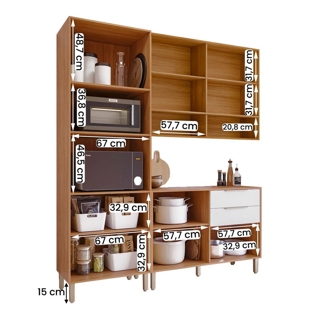O Cozinha Divina com Torre Quente 190 cm é a solução perfeita para quem busca praticidade, elegância e otimização do espaço! Com estrutura 100% MDF, 8 portas, 2 gavetas com corrediças telescópicas e prateleiras bem distribuídas, ele acomoda fornos, utensílios e mantimentos com estilo. Pés com regulagem e acabamento moderno garantem sofisticação e funcionalidade para sua cozinha! Modelo: Cozinha Divina com Torre Quente 190 cm; Material da estrutura: em MDF; Dimensões: 190 cm(L) x 223,5 cm(A) x 47 cm(P); Profundidade inferior: 47 cm; Profundidade superior: 32 cm; Quantidade de portas: 08, sendo 1 basculante com pistão a gás (dobradiças metálicas com fechamento soft close); Quantidade de Gavetas: 02 (corrediças telescópicas); Medidas internas das Gavetas: 52,8 cm(L) x 37,3 cm(P) x 11 cm(A); Com puxador: Sim, em plástico; Quantidade prateleiras: 8; Pés com regulagem: Sim, em 15 cm; Peso suportado: até 95 kg distribuídos; Requer montagem: Sim (kit montagem incluso). Tonalidade de Cores: Cinamomo: Fosca Texturizada; Off White: Fosca Texturizada; Branco: Fosca Texturizada; Titanium: Fosca Texturizada. Informações adicionais: - Os objetos que ambientam as fotos não acompanham o produto; - É de inteira responsabilidade do cliente a montagem do produto e/ou instalação, assim como possíveis irregularidades provenientes de manuseio inadequado; - Embora o produto acompanhe o manual de montagem, verifique a complexidade antes de decidir montá-lo sozinho, recomendamos que contrate um profissional de sua confiança; - Fique atento, nossas cores podem sofrer alterações dependendo do seu monitor; - ANTES DE MONTAR O SEU PRODUTO, verifique se há alguma peça danificada, caso esteja, prestaremos a devida assistência dentro do prazo da garantia.