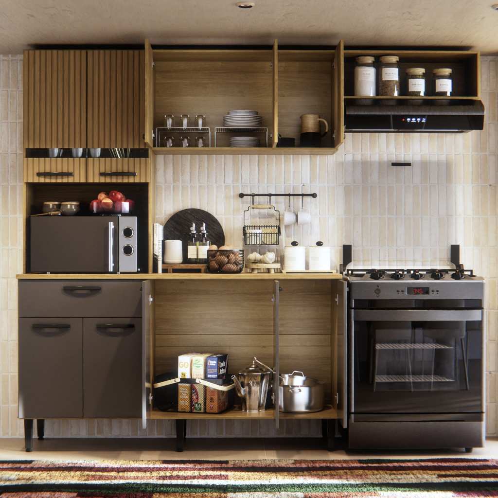 🏠 Armário de Cozinha Dora 200cm – espaço, organização e visual moderno para sua cozinha O Armário de Cozinha Dora é ideal para quem busca uma cozinha mais organizada, funcional e elegante no dia a dia. Com estrutura completa e ótimo aproveitamento de espaço, ele reúne balcão, armários aéreos e nichos em um conjunto moderno que ajuda a manter utensílios, mantimentos, louças e eletrodomésticos sempre bem distribuídos. Seu acabamento em Damasco Cinza com detalhe ripado traz um visual sofisticado e atual, perfeito para cozinhas modernas, planejadas ou compactas. ✨ Principais benefícios ✅ Cozinha mais organizada Conta com muitos compartimentos para separar utensílios, louças, panelas, mantimentos e acessórios. ✅ Conjunto completo e funcional Composto por balcão + armários aéreos + nichos, oferecendo excelente aproveitamento vertical e horizontal. ✅ 10 portas e 1 gaveta Mais espaço para guardar tudo o que você usa no dia a dia com praticidade. ✅ Nicho para eletrodomésticos Ideal para acomodar micro-ondas, cafeteira, potes ou itens decorativos. ✅ Visual moderno com detalhe ripado Valoriza a decoração da cozinha e combina com diferentes estilos de ambiente. ✅ Pés elevados Facilitam a limpeza do piso e ajudam na ventilação do móvel. 🪵 Material e qualidade 🔹 Estrutura em MDF/MDP 🔹 Material resistente para uso diário 🔹 Ótimo equilíbrio entre durabilidade e custo-benefício 🔹 Acabamento moderno e fácil de combinar com outros móveis 📦 Características do produto 🔹 Modelo: Dora 🔹 Armário de cozinha completo 🔹 Composição com balcão, armários aéreos e nichos 🔹 10 portas 🔹 1 gaveta 🔹 Nicho para micro-ondas e eletros 🔹 Pés elevados 🔹 Design moderno com detalhe ripado 🔹 Cor: Damasco Cinza 📏 Medidas aproximadas • Largura: 200 cm • Altura: 200 cm • Profundidade: 38 cm 📦 Itens inclusos • 1 Armário de Cozinha Dora • Manual de montagem • Kit de ferragens ⚠️ Informações importantes • Produto enviado desmontado • Montagem por conta do comprador • Eletrodomésticos, utensílios e objetos decorativos não acompanham o produto • Pode haver pequena variação de tonalidade conforme iluminação ou tela do dispositivo • Indicado para uso em ambiente interno • Evite exposição direta ao sol e à umidade para maior durabilidade