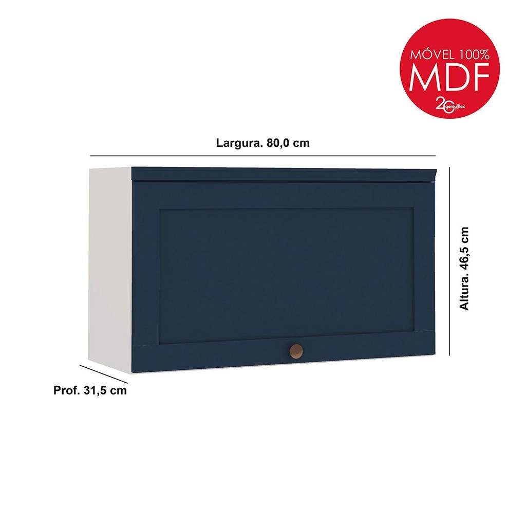 Deixe seu espaço do jeitinho que você precisa com o armário aéreo de cozinha Genialflex com porta basculante. Você pode usá-lo sozinho ou combinar com outros módulos da linha pra criar uma composição que é a sua cara! É aquele tipo de móvel que facilita o dia a dia! Super prático e versátil, ele vai bem não só na cozinha, mas também na lavanderia ou em outros cantinhos da casa. Com 80 cm de largura, oferece um ótimo espaço interno e é fácil de acessar, ideal para guardar tudo com mais praticidade. A porta basculante é um charme à parte: abre e fecha com suavidade, trazendo ainda mais comodidade para a rotina. Feito em MDF, o armário é resistente, durável e tem um acabamento elegante que dá um toque moderno ao ambiente. Como todo móvel da Genialflex, esse armário une design funcional com qualidade de verdade. É a escolha certa para quem quer um espaço mais bonito, bem aproveitado e sempre organizado! ESPECIFICAÇÕES - 100% MDF BP 15 mm - Porta com moldura provençal no estilo americano - Caixa em pintura UV e frente em MDF BP - Puxador ABS de cor champanhe (feito de plástico super resistente e leve, muito usado em móveis do dia a dia) - Dobradiças slowmotion com amortecedor incorporado, proporcionando um fechamento suave e silencioso - Caixa no padrão branco com porta na cor azul. PESO SUPORTADO Suporta até 10 kg MEDIDAS DO AÉREO - Largura: 80 cm - Altura: 46,5 cm - Profundidade: 31,5 cm INSTRUÇÕES DE MONTAGEM O produto acompanha kit de ferragens e manual de montagem (serviço de montagem não incluso). CONTÉM NA EMBALAGEM O produto é enviado desmontado em 2 volumes, devidamente protegido com papelão, isopor e plástico termoencolhível. TIPO DE FIXAÇÃO A fixação é feita com girofix, cavilhas e parafusos (fixar na parede). DÚVIDAS COMUNS O produto é entregue montado? Não, os móveis são enviados desmontados, com um manual e todos os componentes necessários para a montagem. Vocês oferecem serviço de montagem? Não oferecemos serviço de montagem. Qual é o valor da entrega? O valor da entrega é calculado de acordo com o CEP de destino. Os produtos são novos? Sim, todos os nossos produtos são novos. Vocês entregam em todo o Brasil? Sim, realizamos entregas para todo o território nacional. LIMPEZA Para a limpeza, use um pano levemente umedecido com água. Evite produtos abrasivos e esponjas de aço. GARANTIA Cobertura de 3 meses contra defeitos de fabricação. CONSIDERAÇÕES IMPORTANTES - Durante a montagem, as peças devem ser montadas com a parte de trás voltada para cima, apoiando o móvel sobre o papelão da embalagem para evitar danos. - Evite o contato com fontes de calor ou umidade. - As imagens são meramente ilustrativas e os objetos decorativos não estão inclusos. - As cores podem variar dependendo da configuração da tela do dispositivo. - A entrega será realizada até a porta de entrada ou portaria do endereço informado. Caso autorizado pela portaria, o produto será deixado no andar térreo. O transporte até o interior do imóvel é responsabilidade do cliente.