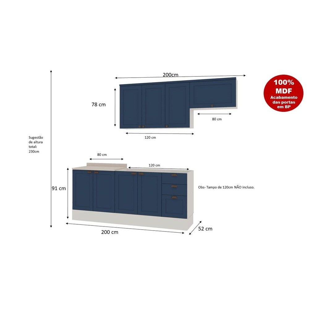 Os produtos da Genialflex combinam design moderno e funcionalidade para tornar seu espaço mais organizado e sofisticado. Produzidos com materiais de alta qualidade, oferecem resistência e durabilidade, além de um acabamento impecável que valoriza qualquer ambiente. A Cozinha Modulada Iluminata com 4 Peças em MDF é um conjunto moderno e funcional, ideal para quem busca praticidade e organização no ambiente. Composta por 4 módulos, proporciona amplo espaço de armazenamento, permitindo acomodar utensílios, eletrodomésticos e mantimentos de forma eficiente. ESPECIFICAÇÕES - Material: MDF/BP 15 mm - Bordas melamínicas - Corrediças metalica - Dobradiças com amortecimento PESO SUPORTADO - Plateleira suporta : até 5 kg - Gaveta central suporta: até 3 kg - Gaveta lateral suporta: até 5 kg MEDIDAS DA COZINHA - Largura: 190 cm - Altura: 230 cm - Profundidade: 52 cm INSTRUÇÕES DE MONTAGEM - O produto acompanha kit de ferragens e manual de montagem (serviço de montagem não incluso). CONTÉM NA EMBALAGEM - O produto é enviado desmontado em 12 volumes, devidamente protegido com papelão, isopor e plástico termoencolhível. TIPO DE FIXAÇÃO - A fixação é feita com girofix, cavilhas e (não é necessário fixar na parede). DÚVIDAS COMUNS - O produto é entregue montado? Não, os móveis são enviados desmontados, com um manual e todos os componentes necessários para a montagem. - Vocês oferecem serviço de montagem? Não oferecemos serviço de montagem. - Qual é o valor da entrega? O valor da entrega é calculado de acordo com o CEP de destino. - Os produtos são novos? Sim, todos os nossos produtos são novos. - Vocês entregam em todo o Brasil? Sim, realizamos entregas para todo o território nacional. LIMPEZA - Para a limpeza, use um pano levemente umedecido com água. Evite produtos abrasivos e esponjas de aço. GARANTIA - Cobertura de 3 meses contra defeitos de fabricação. CONSIDERAÇÕES IMPORTANTES - Durante a montagem, as peças devem ser montadas com a parte de trás voltada para cima, apoiando o móvel sobre o papelão da embalagem para evitar danos. - Evite o contato com fontes de calor ou umidade. - As imagens são meramente ilustrativas e os objetos decorativos não estão inclusos. - As cores podem variar dependendo da configuração da tela do dispositivo. - A entrega será realizada até a porta de entrada ou portaria do endereço informado. Caso autorizado pela portaria, o produto será deixado no andar térreo. O transporte até o interior do imóvel é responsabilidade do cliente.