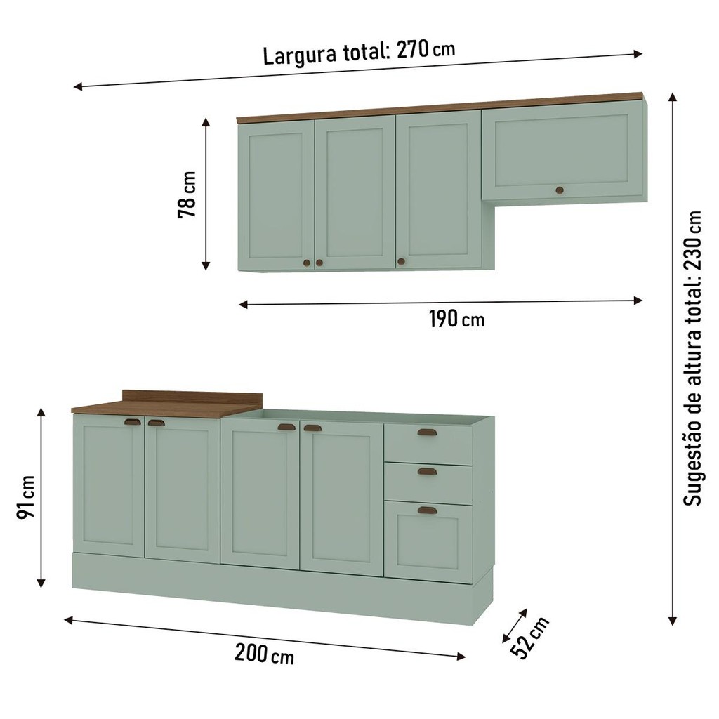 Imagina ter uma cozinha linda, prática e cheia de estilo? O Armário de Cozinha Genialflex 4 Peças Verde Mint é aquele conjunto que vai deixar seu espaço super organizado sem perder o charme. Produzido 100% em MDF, ele traz portas no estilo provençal americano que dão um toque diferenciado, puxadores modernos e acabamento em tom suave que combina facilmente com diversos ambientes. O conjunto conta balcões que somam 4 portas e 3 gavetas funcionais, perfeitas para organizar talheres, panelas e utensílios do dia a dia, além de espaço interno bem dividido para manter tudo sempre à mão. O aéreo com 4 portas amplia ainda mais a capacidade de armazenamento, deixando sua cozinha sempre prática e arrumada. Ah, e vale lembrar: o balcão de 120 cm vem sem o tampo, perfeito pra você colocar uma pia de inox ou escolher o tampo que mais combina com o seu ambiente. A cor Verde Mint é super atual e transmite leveza, enquanto o tampo amadeirado no padrão Ébano dá aquele contraste aconchegante e sofisticado. No fim das contas, é o tipo de cozinha que junta tudo o que a gente procura: beleza, praticidade e qualidade em um só lugar. Completa, moderna e cheia de estilo, pra deixar seu dia a dia muito mais fácil e seu cantinho ainda mais especial. A Genialflex acredita que sua casa merece muito mais do que apenas funcionalidade — ela merece estilo, conforto e aquele toque especial que deixa tudo com a sua cara. Por isso, a gente desenvolve peças modernas, resistentes e fáceis de combinar, sempre pensando em praticidade, qualidade e ótimo custo-benefício. Seja na cozinha, no quarto ou na sala, nossos móveis são feitos pra transformar o dia a dia em momentos mais leves, organizados e cheios de charme. MÓDULOS QUE COMPÕEM A COZINHA ILUMINATA 4 PEÇAS VERDE MINT - 1 armário aéreo de 3 portas 120 cm - 1 armário aéreo porta basculante de 70 cm - 1 balcão de 120 cm com 2 portas e 3 gavetas sem tampo - 1 balcão de 80 cm com 2 portas - 1 tampo padrão Ébano para o balcão de 80 cm ESPECIFICAÇÕES - 100% MDF 15 mm - Portas com moldura provençal no estilo americano - Caixa em pintura UV e frentes em MDF/BP - Puxadores ABS (feito de plástico super resistente e leve, muito usado em móveis do dia a dia) - Dobradiças com amortecimento proporcionando um fechamento suave e silencioso - Corrediças telescópicas de 3 estágios garantindo abertura total - Tampo de 25 mm em MDF/BP impermeável - Cor Verde Mint (verde suave) - Tampo e molduras amadeirados padrão Ébano - Balcões com altura padrão de planejado (91 cm) - Módulos aéreos caracterizados por molduras engrossuradas - Pés com regulagem de altura - Com divisor de talheres incluso PESO SUPORTADO - Prateleiras até 10 kg cada - Gavetas até 8 kg cada - Gavetão até 15 kg cada - Tampo até 20 kg cada MEDIDAS DA COZINHA - Largura: 270 cm - Altura: 230 cm - Profundidade: 52 cm INSTRUÇÕES DE MONTAGEM O produto acompanha kit de ferragens e manual de montagem (serviço de montagem não incluso). CONTÉM NA EMBALAGEM O produto é enviado desmontado em 12 volumes, devidamente protegidos com papelão, isopor e plástico termoencolhível. TIPO DE FIXAÇÃO A fixação é feita com girofix, cavilhas e parafusos (não é necessário fixar na parede). DÚVIDAS COMUNS O produto é entregue montado? Não, os móveis são enviados desmontados, com um manual e todos os componentes necessários para a montagem. Vocês oferecem serviço de montagem? Não oferecemos serviço de montagem. Qual é o valor da entrega? O valor da entrega é calculado de acordo com o CEP de destino. Os produtos são novos? Sim, todos os nossos produtos são novos. Vocês entregam em todo o Brasil? Sim, realizamos entregas para todo o território nacional. LIMPEZA Para a limpeza, use um pano levemente umedecido com água. Evite produtos abrasivos e esponjas de aço. GARANTIA Cobertura de 3 meses contra defeitos de fabricação. CONSIDERAÇÕES IMPORTANTES - Durante a montagem, as peças devem ser montadas com a parte de trás voltada para cima, apoiando o móvel sobre o papelão da embalagem para evitar danos. - Evite o contato com fontes de calor ou umidade. - As imagens são meramente ilustrativas e os objetos decorativos não estão inclusos. - As cores podem variar dependendo da configuração da tela do dispositivo. - A entrega será realizada até a porta de entrada ou portaria do endereço informado. Caso autorizado pela portaria, o produto será deixado no andar térreo. O transporte até o interior do imóvel é responsabilidade do cliente.