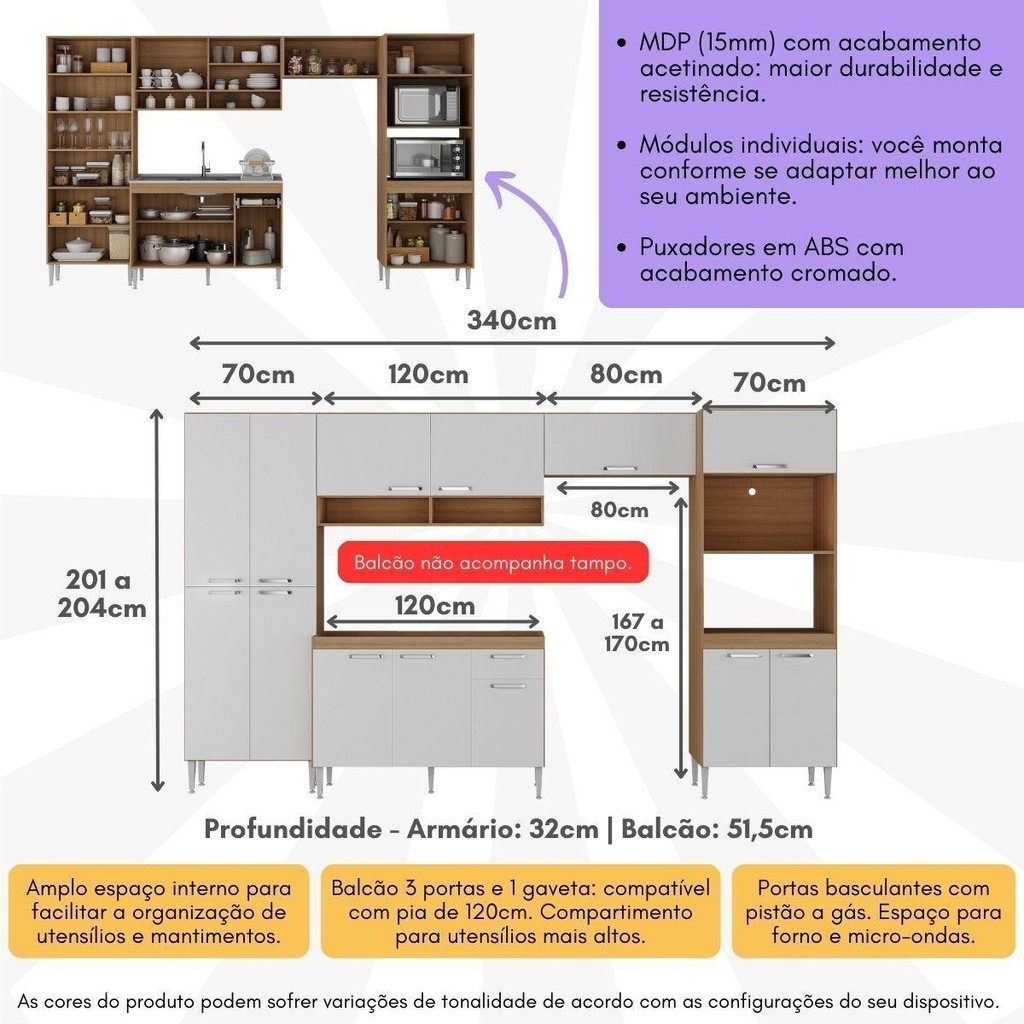 Transforme sua cozinha em um espaço de elegância e funcionalidade com o Armário de Cozinha Completa Paris da Multimóveis MP2222. Fabricado em MDP de alta qualidade com 15mm de espessura, este conjunto oferece durabilidade e estilo para o seu ambiente culinário. O acabamento acetinado, com cerca de 20% de brilho, adiciona um toque de sofisticação, enquanto os pés em polipropileno com regulagem de altura garantem estabilidade e adaptação a qualquer superfície. Os puxadores em ABS com acabamento cromado proporcionam praticidade e resistência, complementando o design moderno deste conjunto. O armário aéreo de 120cm oferece nichos na parte inferior, ideal para organizar temperos e utensílios menores, enquanto o armário aéreo de 80cm possui uma porta basculante equipada com pistões a gás para abertura suave e sem esforço. A torre quente apresenta um compartimento dedicado para forno e microondas, integrando esses aparelhos ao design da cozinha. O balcão, compatível com pia de 120cm (tampo não incluso) possui uma gaveta equipada com corrediças telescópicas tornando o acesso aos utensílios suave e silencioso. Os módulos são individuais e permitem montagem conforme a necessidade do ambiente. Conteúdo da Embalagem: 1 (um) Paneleiro 70cm 1 (uma) Torre Quente 70cm 1 (um) Balcão 120cm sem tampo 1 (um) Armário Aéreo 120cm 1 (um) Armário Aéreo 80cm Manual de Montagem Kit Ferragem Dimensões do produto montado: Altura: 204cm | Largura: 340cm | Profundidade: 51,5cm Espaço do nicho para fogão/geladeira: Altura: 170cm | Largura: 80cm *Você pode consultar as medidas detalhadas na imagem técnica do produto. *As cores do produto podem sofrer variações de tonalidade de acordo com as configurações do seu dispositivo. Imagem meramente ilustrativa. Decoração e eletros não acompanham o produto. O produto será entregue desmontado e não disponibilizamos o serviço de montagem.