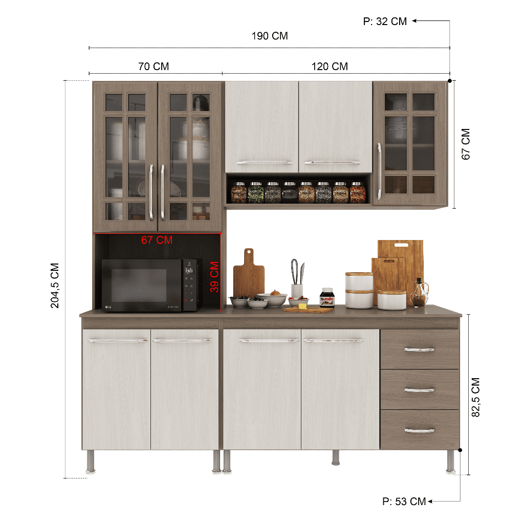 A Cozinha Paris da Fidelitá combina elegância e funcionalidade, trazendo um design sofisticado com linhas delicadas e acabamento em pintura UV de alta qualidade. O padrão Nogal, com brilho, adiciona um toque de sofisticação e aconchego ao ambiente, enquanto o Salinas em acabamento fosco garante modernidade, leveza visual e fácil harmonização com diferentes estilos de decoração, tornando sua cozinha mais bonita, atual e acolhedora no dia a dia. Com módulos avulsos, cada peça é independente, permitindo diferentes composições para melhor aproveitamento do espaço. Seu interior é bem distribuído, com prateleiras e divisórias que auxiliam na organização de utensílios e mantimentos. Fabricada em MDP de 15mm, a estrutura garante resistência e durabilidade, enquanto as portas de vidro em MDF de 15mm elevam o padrão de qualidade e sofisticação do produto. As corrediças telescópicas e dobradiças metálicas proporcionam um deslizamento suave e seguro. Além disso, os puxadores cromados em ABS e os pés plásticos com regulagem de altura agregam praticidade e um toque moderno ao conjunto. Dimensões: 📌Largura total: 190cm 📌Altura total: 204,5cm 📌Profundidade: 53cm (balcões) | 32cm (aéreos) O balcão acompanha tampo de MDP 15mm removível, possibilitando a instalação de uma pia com espaço de 120cm x 53cm. Itens inclusos: ✅ Aéreo (120cm) – 3 portas (1 de vidro) ✅ Torre Quente (70cm) – 4 portas (2 de vidro) e espaço para forno/micro-ondas sendo (Altura: 39cm x Largura: 67cm x Profundidade: 53cm) ✅ Balcão (120cm) – 3 portas, 3 gavetas e tampo removível Observação: A Fidelitá Móveis não realiza montagem. O produto é enviado desmontado, acompanhado de manual de instalação e todas as ferragens necessárias. 📅Garantia: 6 meses para defeitos de fabricação e vícios ocultos. 🖼️Imagem meramente ilustrativa. Por segurança, é necessário fixar os módulos na parede. Dúvidas P: Os módulos podem ser montados separadamente ou apenas na disposição da imagem? Sim! Como os módulos são avulsos, você pode organizá-los conforme seu espaço e necessidade. P: O balcão suporta pia de inox ou granito? Sim! O tampo de MDP de 15mm pode ser removido para instalação de uma pia de até 120cm x 53cm pesando até 40kg. P: Os pés da cozinha são reguláveis? Sim! Os pés são de plástico resistente e possuem 14cm padrões e regulagem para nivelamento do móvel acrescentando mais 3cm sobre a altura total. P: A Fidelitá realiza a montagem da cozinha? Não. O produto é enviado desmontado, acompanhado pelo manual de montagem e todas as ferragens necessárias para a instalação. P: Os puxadores são de metal? Não. Os puxadores são em ABS cromado, garantindo leveza e resistência.