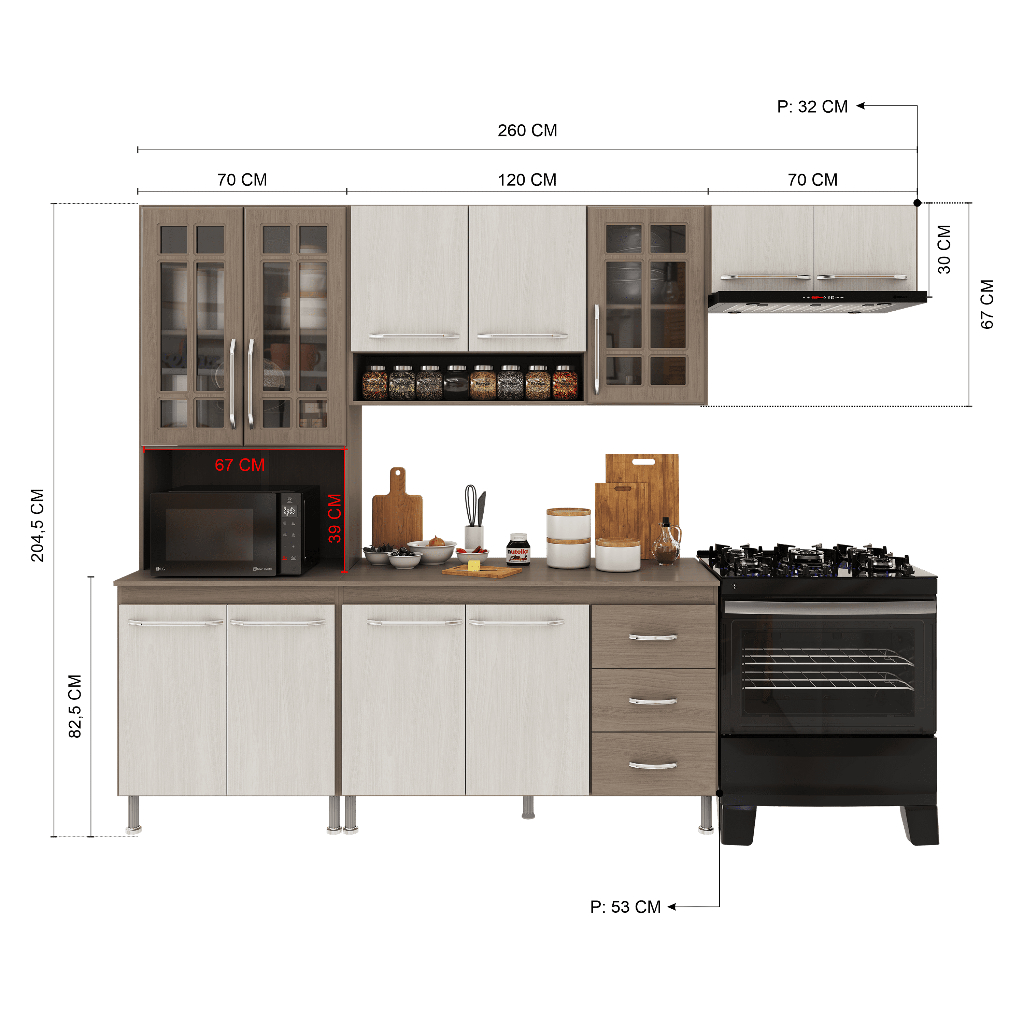A Cozinha Paris da Fidelitá combina elegância e funcionalidade, trazendo um design sofisticado com linhas delicadas e acabamento em pintura UV de alta qualidade. O padrão Nogal, com brilho, adiciona um toque de sofisticação e aconchego ao ambiente, enquanto o Salinas em acabamento fosco garante modernidade, leveza visual e fácil harmonização com diferentes estilos de decoração, tornando sua cozinha mais bonita, atual e acolhedora no dia a dia. Com módulos avulsos, cada peça é independente, permitindo diferentes composições para melhor aproveitamento do espaço. Seu interior é bem distribuído, com prateleiras e divisórias que auxiliam na organização de utensílios e mantimentos. Fabricada em MDP de 15mm, a estrutura garante resistência e durabilidade, enquanto as portas de vidro em MDF de 15mm elevam o padrão de qualidade e sofisticação do produto. As corrediças telescópicas e dobradiças metálicas proporcionam um deslizamento suave e seguro. Além disso, os puxadores cromados em ABS e os pés plásticos com regulagem de altura agregam praticidade e um toque moderno ao conjunto. Dimensões: 📌 Largura total: 260cm 📌 Altura total: 204,5cm 📌 Profundidade: 53cm (balcões) | 32cm (aéreos) O balcão acompanha tampo de MDP 15mm removível, possibilitando a instalação de uma pia com espaço de 120cm x 53cm. Itens inclusos: ✅ Aéreo (120cm) – 3 portas (1 de vidro) ✅ Torre Quente (70cm) – 4 portas (2 de vidro) e espaço para forno/micro-ondas sendo (Altura: 39cm x Largura: 67cm x Profundidade: 53cm) ✅ Aéreo (70cm) – 2 portas ✅ Balcão (120cm) – 3 portas, 3 gavetas e tampo removível Observação: A Fidelitá Móveis não realiza montagem. O produto é enviado desmontado, acompanhado de manual de instalação e todas as ferragens necessárias. 📅Garantia: 6 meses para defeitos de fabricação e vícios ocultos. 🖼️Imagem meramente ilustrativa. Por segurança, é necessário fixar os módulos na parede. Dúvidas P: Os módulos podem ser montados separadamente ou apenas na disposição da imagem? Sim! Como os módulos são avulsos, você pode organizá-los conforme seu espaço e necessidade. P: O balcão suporta pia de inox ou granito? Sim! O tampo de MDP de 15mm pode ser removido para instalação de uma pia de até 120cm x 53cm pesando até 40kg. P: Os pés da cozinha são reguláveis? Sim! Os pés são de plástico resistente e possuem 14cm padrões e regulagem para nivelamento do móvel acrescentando mais 3cm sobre a altura total. P: A Fidelitá realiza a montagem da cozinha? Não. O produto é enviado desmontado, acompanhado pelo manual de montagem e todas as ferragens necessárias para a instalação. P: Os puxadores são de metal? Não. Os puxadores são em ABS cromado, garantindo leveza e resistência.
