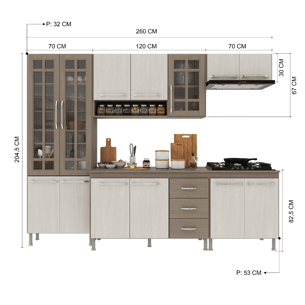 A Cozinha Paris da Fidelitá combina elegância e funcionalidade, trazendo um design sofisticado com linhas delicadas e acabamento em pintura UV de alta qualidade. O padrão Nogal, com brilho, adiciona um toque de sofisticação e aconchego ao ambiente, enquanto o Salinas em acabamento fosco garante modernidade, leveza visual e fácil harmonização com diferentes estilos de decoração, tornando sua cozinha mais bonita, atual e acolhedora no dia a dia. Com módulos avulsos, cada peça é independente, permitindo diferentes composições para melhor aproveitamento do espaço. Seu interior é bem distribuído, com prateleiras e divisórias que auxiliam na organização de utensílios e mantimentos. Fabricada em MDP de 15mm, a estrutura garante resistência e durabilidade, enquanto as portas de vidro em MDF de 15mm elevam o padrão de qualidade e sofisticação do produto. As corrediças telescópicas e dobradiças metálicas proporcionam um deslizamento suave e seguro. Além disso, os puxadores cromados em ABS e os pés plásticos com regulagem de altura agregam praticidade e um toque moderno ao conjunto. Dimensões: 📌Largura total: 260cm 📌Altura total: 204,5cm 📌Profundidade: 53cm (balcões) | 32cm (aéreos) Os balcões acompanham tampos de MDP 15mm removíveis, possibilitando a instalação de uma pia com espaço de 120cm x 53cm no balcão (120cm). O balcão (70cm) suporta cooktop, o mesmo não vai recortado e para sua customização o gabarito esta na própria embalagem. Itens inclusos: ✅ Aéreo (120cm) – 3 portas (1 de vidro) ✅ Paneleiro Duplo (70cm) - 4 portas, (2 de vidro) ✅ Armário (70cm) - 2 portas ✅ Balcão (70cm)- 2 portas e tampo. ✅ Balcão (120cm) – 3 portas, 3 gavetas e tampo removível Observação: A Fidelitá Móveis não realiza montagem. O produto é enviado desmontado, acompanhado de manual de instalação e todas as ferragens necessárias. 📅Garantia: 6 meses para defeitos de fabricação e vícios ocultos. 🖼️Imagem meramente ilustrativa. Por segurança, é necessário fixar os módulos na parede. Dúvidas P: Os módulos podem ser montados separadamente ou apenas na disposição da imagem? Sim! Como os módulos são avulsos, você pode organizá-los conforme seu espaço e necessidade. P: O balcão suporta pia de inox ou granito? Sim! O tampo de MDP de 15mm pode ser removido para instalação de uma pia de até 120cm x 53cm pesando até 40kg. P: Os pés da cozinha são reguláveis? Sim! Os pés são de plástico resistente e possuem 14cm padrões e regulagem para nivelamento do móvel acrescentando mais 3cm sobre a altura total. P: A Fidelitá realiza a montagem da cozinha? Não. O produto é enviado desmontado, acompanhado pelo manual de montagem e todas as ferragens necessárias para a instalação. P: Os puxadores são de metal? Não. Os puxadores são em ABS cromado, garantindo leveza e resistência.