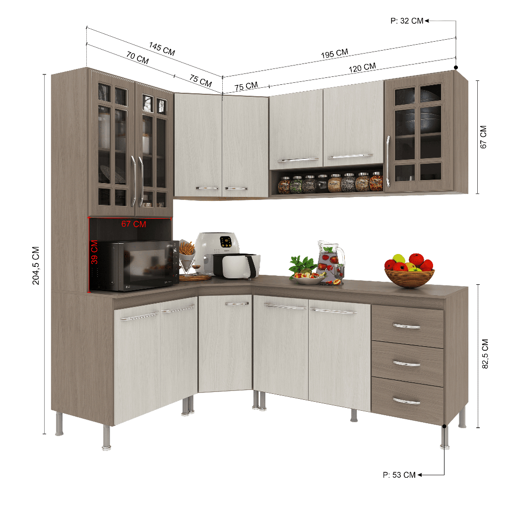 A Cozinha Paris da Fidelitá combina elegância e funcionalidade, trazendo um design sofisticado com linhas delicadas e acabamento em pintura UV de alta qualidade. O padrão Nogal, com brilho, adiciona um toque de sofisticação e aconchego ao ambiente, enquanto o Salinas em acabamento fosco garante modernidade, leveza visual e fácil harmonização com diferentes estilos de decoração, tornando sua cozinha mais bonita, atual e acolhedora no dia a dia. Com módulos avulsos, cada peça é independente, permitindo diferentes composições para melhor aproveitamento do espaço. Seu interior é bem distribuído, com prateleiras e divisórias que auxiliam na organização de utensílios e mantimentos. Fabricada em MDP de 15mm, a estrutura garante resistência e durabilidade, enquanto as portas de vidro em MDF de 15mm elevam o padrão de qualidade e sofisticação do produto. As corrediças telescópicas e dobradiças metálicas proporcionam um deslizamento suave e seguro. Além disso, os puxadores cromados em ABS e os pés plásticos com regulagem de altura agregam praticidade e um toque moderno ao conjunto. Dimensões: 📌 Largura total: 340cm 📌 Altura total: 204,5cm 📌 Profundidade: 53cm (balcões) | 32cm (aéreos) O balcão acompanha tampo de MDP 15mm removíveis, possibilitando a instalação de uma pia com espaço de 120cm x 53cm no balcão (120cm). Itens inclusos: ✅ Aéreo (120cm) – 3 portas (1 de vidro) ✅ Aéreo de Canto (75cm) - 2 portas ✅ Torre Quente (70cm) – 4 portas (2 de vidro) e espaço para forno/micro-ondas sendo (Altura: 39cm x Largura: 67cm x Profundidade: 53cm) ✅ Balcão de Canto (75cm) - 1 porta ✅ Balcão (120cm) – 3 portas, 3 gavetas e tampo removível Observação: A Fidelitá Móveis não realiza montagem. O produto é enviado desmontado, acompanhado de manual de instalação e todas as ferragens necessárias. 📅Garantia: 6 meses para defeitos de fabricação e vícios ocultos. 🖼️Imagem meramente ilustrativa. Por segurança, é necessário fixar os módulos na parede. Dúvidas P: Os módulos podem ser montados separadamente ou apenas na disposição da imagem? Sim! Como os módulos são avulsos, você pode organizá-los conforme seu espaço e necessidade. P: O balcão suporta pia de inox ou granito? Sim! O tampo de MDP de 15mm pode ser removido para instalação de uma pia de até 120cm x 53cm pesando até 40kg. P: Os pés da cozinha são reguláveis? Sim! Os pés são de plástico resistente e possuem 14cm padrões e regulagem para nivelamento do móvel acrescentando mais 3cm sobre a altura total. P: A Fidelitá realiza a montagem da cozinha? Não. O produto é enviado desmontado, acompanhado pelo manual de montagem e todas as ferragens necessárias para a instalação. P: Os puxadores são de metal? Não. Os puxadores são em ABS cromado, garantindo leveza e resistência.