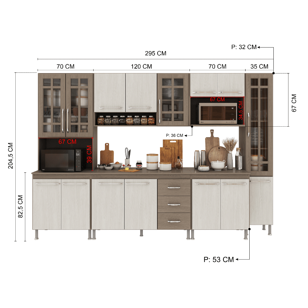 A Cozinha Paris da Fidelitá combina elegância e funcionalidade, trazendo um design sofisticado com linhas delicadas e acabamento em pintura UV de alta qualidade. O padrão Nogal, com brilho, adiciona um toque de sofisticação e aconchego ao ambiente, enquanto o Salinas em acabamento fosco garante modernidade, leveza visual e fácil harmonização com diferentes estilos de decoração, tornando sua cozinha mais bonita, atual e acolhedora no dia a dia. Com módulos avulsos, cada peça é independente, permitindo diferentes composições para melhor aproveitamento do espaço. Seu interior é bem distribuído, com prateleiras e divisórias que auxiliam na organização de utensílios e mantimentos. Fabricada em MDP de 15mm, a estrutura garante resistência e durabilidade, enquanto as portas de vidro em MDF de 15mm elevam o padrão de qualidade e sofisticação do produto. As corrediças telescópicas e dobradiças metálicas proporcionam um deslizamento suave e seguro. Além disso, os puxadores cromados em ABS e os pés plásticos com regulagem de altura agregam praticidade e um toque moderno ao conjunto. Dimensões: 📌 Largura total: 295cm 📌 Altura total: 204,5cm 📌 Profundidade: 53cm (balcões) | 32cm (aéreos) Os balcões acompanham tampos de MDP 15mm removíveis, possibilitando a instalação de uma pia com espaço de 120cm x 53cm no balcão (120cm). O balcão (70cm) suporta cooktop, o mesmo não vai recortado e para sua customização o gabarito esta na própria embalagem. Itens inclusos: ✅ Torre Quente (70cm) – 4 portas (2 de vidro) e espaço para forno/micro-ondas sendo (Altura: 39cm x Largura: 67cm x Profundidade: 53cm) ✅ Aéreo (120cm) – 3 portas (1 de vidro) ✅ Balcão (120cm) – 3 portas, 3 gavetas e tampo removível ✅ Balcão (70cm)- 2 portas e tampo ✅ Armário (70cm) - 2 portas, com espaço para forno/micro-ondas sendo (Altura: 34,5cm x Largura: 67cm x Profundidade: 36cm) ✅ Paneleiro Simples (35cm) – 2 portas (1 de vidro) Observação: A Fidelitá Móveis não realiza montagem. O produto é enviado desmontado, acompanhado de manual de instalação e todas as ferragens necessárias. 📅Garantia: 6 meses para defeitos de fabricação e vícios ocultos. 🖼️Imagem meramente ilustrativa. Por segurança, é necessário fixar os módulos na parede. Dúvidas P: Os módulos podem ser montados separadamente ou apenas na disposição da imagem? Sim! Como os módulos são avulsos, você pode organizá-los conforme seu espaço e necessidade. P: O balcão suporta pia de inox ou granito? Sim! O tampo de MDP de 15mm pode ser removido para instalação de uma pia de até 120cm x 53cm pesando até 40kg. P: Os pés da cozinha são reguláveis? Sim! Os pés são de plástico resistente e possuem 14cm padrões e regulagem para nivelamento do móvel acrescentando mais 3cm sobre a altura total. P: A Fidelitá realiza a montagem da cozinha? Não. O produto é enviado desmontado, acompanhado pelo manual de montagem e todas as ferragens necessárias para a instalação. P: Os puxadores são de metal? Não. Os puxadores são em ABS cromado, garantindo leveza e resistência.