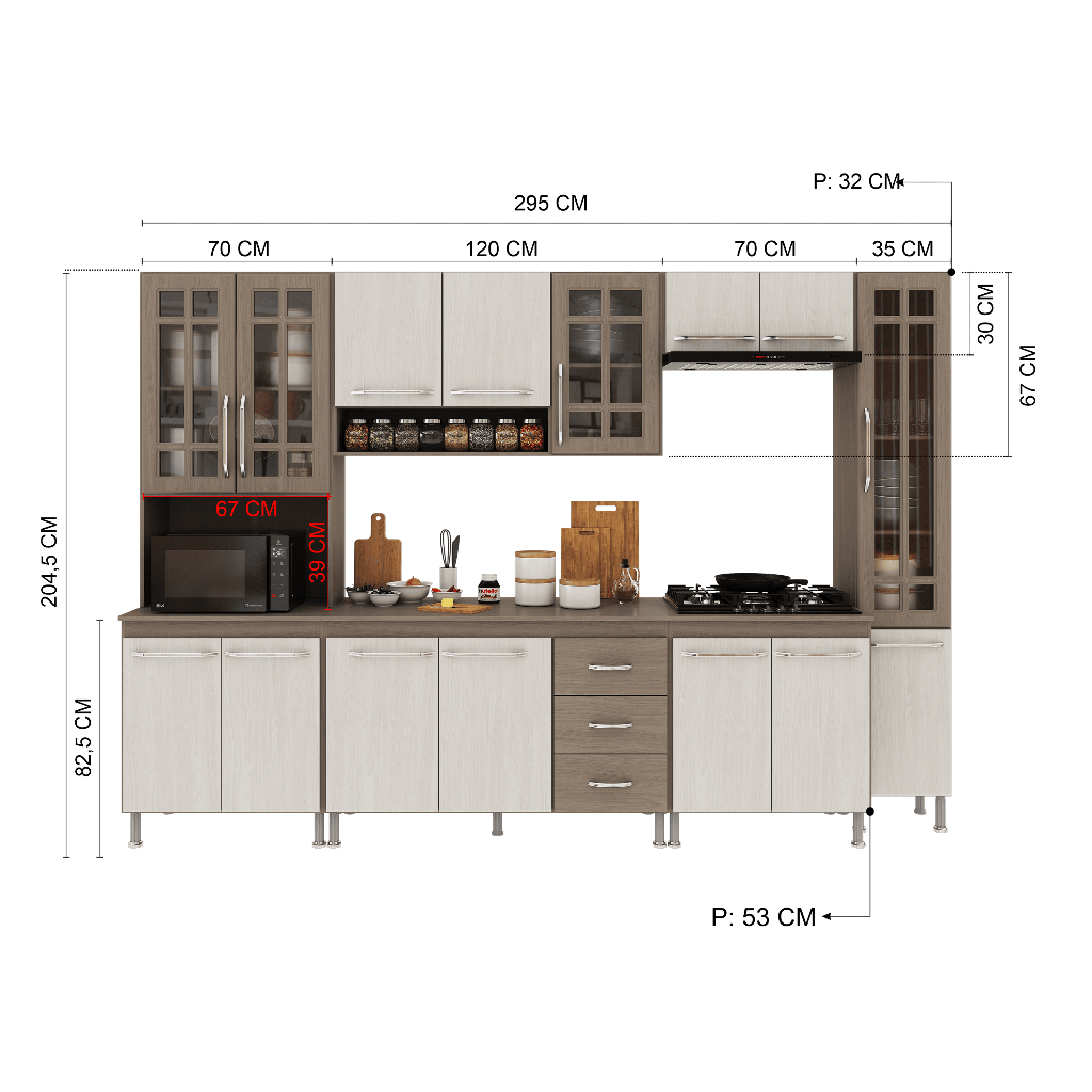 A Cozinha Paris da Fidelitá combina elegância e funcionalidade, trazendo um design sofisticado com linhas delicadas e acabamento em pintura UV de alta qualidade. O padrão Nogal, com brilho, adiciona um toque de sofisticação e aconchego ao ambiente, enquanto o Salinas em acabamento fosco garante modernidade, leveza visual e fácil harmonização com diferentes estilos de decoração, tornando sua cozinha mais bonita, atual e acolhedora no dia a dia. Com módulos avulsos, cada peça é independente, permitindo diferentes composições para melhor aproveitamento do espaço. Seu interior é bem distribuído, com prateleiras e divisórias que auxiliam na organização de utensílios e mantimentos. Fabricada em MDP de 15mm, a estrutura garante resistência e durabilidade, enquanto as portas de vidro em MDF de 15mm elevam o padrão de qualidade e sofisticação do produto. As corrediças telescópicas e dobradiças metálicas proporcionam um deslizamento suave e seguro. Além disso, os puxadores cromados em ABS e os pés plásticos com regulagem de altura agregam praticidade e um toque moderno ao conjunto. Dimensões: 📌 Largura total: 295cm 📌 Altura total: 204,5cm 📌 Profundidade: 53cm (balcões) | 32cm (aéreos) Os balcões acompanham tampos de MDP 15mm removíveis, possibilitando a instalação de uma pia com espaço de 120cm x 53cm no balcão (120cm). O balcão (70cm) suporta cooktop, o mesmo não vai recortado e para sua customização o gabarito esta na própria embalagem. Itens inclusos: ✅ Torre Quente (70cm) – 4 portas (2 de vidro) e espaço para forno/micro-ondas sendo (Altura: 39cm x Largura: 67cm x Profundidade: 53cm) ✅ Aéreo (120cm) – 3 portas (1 de vidro) ✅ Aéreo (70cm) – 2 portas ✅ Paneleiro Simples (35cm) – 2 portas (1 de vidro) ✅ Balcão (120cm) – 3 portas, 3 gavetas e tampo removível ✅ Balcão (70cm)- 2 portas e tampo Observação: A Fidelitá Móveis não realiza montagem. O produto é enviado desmontado, acompanhado de manual de instalação e todas as ferragens necessárias. 📅Garantia: 6 meses para defeitos de fabricação e vícios ocultos. 🖼️Imagem meramente ilustrativa. Por segurança, é necessário fixar os módulos na parede. Dúvidas P: Os módulos podem ser montados separadamente ou apenas na disposição da imagem? Sim! Como os módulos são avulsos, você pode organizá-los conforme seu espaço e necessidade. P: O balcão suporta pia de inox ou granito? Sim! O tampo de MDP de 15mm pode ser removido para instalação de uma pia de até 120cm x 53cm pesando até 40kg. P: Os pés da cozinha são reguláveis? Sim! Os pés são de plástico resistente e possuem 14cm padrões e regulagem para nivelamento do móvel acrescentando mais 3cm sobre a altura total. P: A Fidelitá realiza a montagem da cozinha? Não. O produto é enviado desmontado, acompanhado pelo manual de montagem e todas as ferragens necessárias para a instalação. P: Os puxadores são de metal? Não. Os puxadores são em ABS cromado, garantindo leveza e resistência.