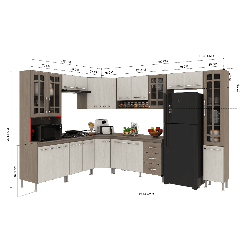 A Cozinha Paris da Fidelitá combina elegância e funcionalidade, trazendo um design sofisticado com linhas delicadas e acabamento em pintura UV de alta qualidade. O padrão Nogal, com brilho, adiciona um toque de sofisticação e aconchego ao ambiente, enquanto o Salinas em acabamento fosco garante modernidade, leveza visual e fácil harmonização com diferentes estilos de decoração, tornando sua cozinha mais bonita, atual e acolhedora no dia a dia. Com módulos avulsos, cada peça é independente, permitindo diferentes composições para melhor aproveitamento do espaço. Seu interior é bem distribuído, com prateleiras e divisórias que auxiliam na organização de utensílios e mantimentos. Fabricada em MDP de 15mm, a estrutura garante resistência e durabilidade, enquanto as portas de vidro em MDF de 15mm elevam o padrão de qualidade e sofisticação do produto. As corrediças telescópicas e dobradiças metálicas proporcionam um deslizamento suave e seguro. Além disso, os puxadores cromados em ABS e os pés plásticos com regulagem de altura agregam praticidade e um toque moderno ao conjunto. Dimensões: 📌 Largura total: 515cm 📌 Altura total: 204,5cm 📌 Profundidade: 53cm (balcões) | 32cm (aéreos) Os balcões acompanham tampos de MDP 15mm removíveis, possibilitando a instalação de uma pia com espaço de 120cm x 53cm no balcão (120cm). O balcão (70cm) suporta cooktop, o mesmo não vai recortado e para sua customização o gabarito esta na própria embalagem. Itens inclusos: ✅ Torre Quente (70cm) – 4 portas (2 de vidro) e espaço para forno/micro-ondas sendo (Altura: 39cm x Largura: 67cm x Profundidade: 53cm) ✅ (2) Aéreo (70cm) – 2 portas ✅ Balcão (70cm)- 2 portas e tampo ✅ Aéreo de Canto (75cm) - 2 portas ✅ Balcão de Canto (75cm) - 1 porta ✅ Aéreo (120cm) – 3 portas (1 de vidro) ✅ Balcão (120cm) – 3 portas, 3 gavetas e tampo removível ✅ Paneleiro Simples (35cm) – 2 portas (1 de vidro) Observação: A Fidelitá Móveis não realiza montagem. O produto é enviado desmontado, acompanhado de manual de instalação e todas as ferragens necessárias. 📅Garantia: 6 meses para defeitos de fabricação e vícios ocultos. 🖼️Imagem meramente ilustrativa. Por segurança, é necessário fixar os módulos na parede. Dúvidas P: Os módulos podem ser montados separadamente ou apenas na disposição da imagem? Sim! Como os módulos são avulsos, você pode organizá-los conforme seu espaço e necessidade. P: O balcão suporta pia de inox ou granito? Sim! O tampo de MDP de 15mm pode ser removido para instalação de uma pia de até 120cm x 53cm pesando até 40kg. P: Os pés da cozinha são reguláveis? Sim! Os pés são de plástico resistente e possuem 14cm padrões e regulagem para nivelamento do móvel acrescentando mais 3cm sobre a altura total. P: A Fidelitá realiza a montagem da cozinha? Não. O produto é enviado desmontado, acompanhado pelo manual de montagem e todas as ferragens necessárias para a instalação. P: Os puxadores são de metal? Não. Os puxadores são em ABS cromado, garantindo leveza e resistência.