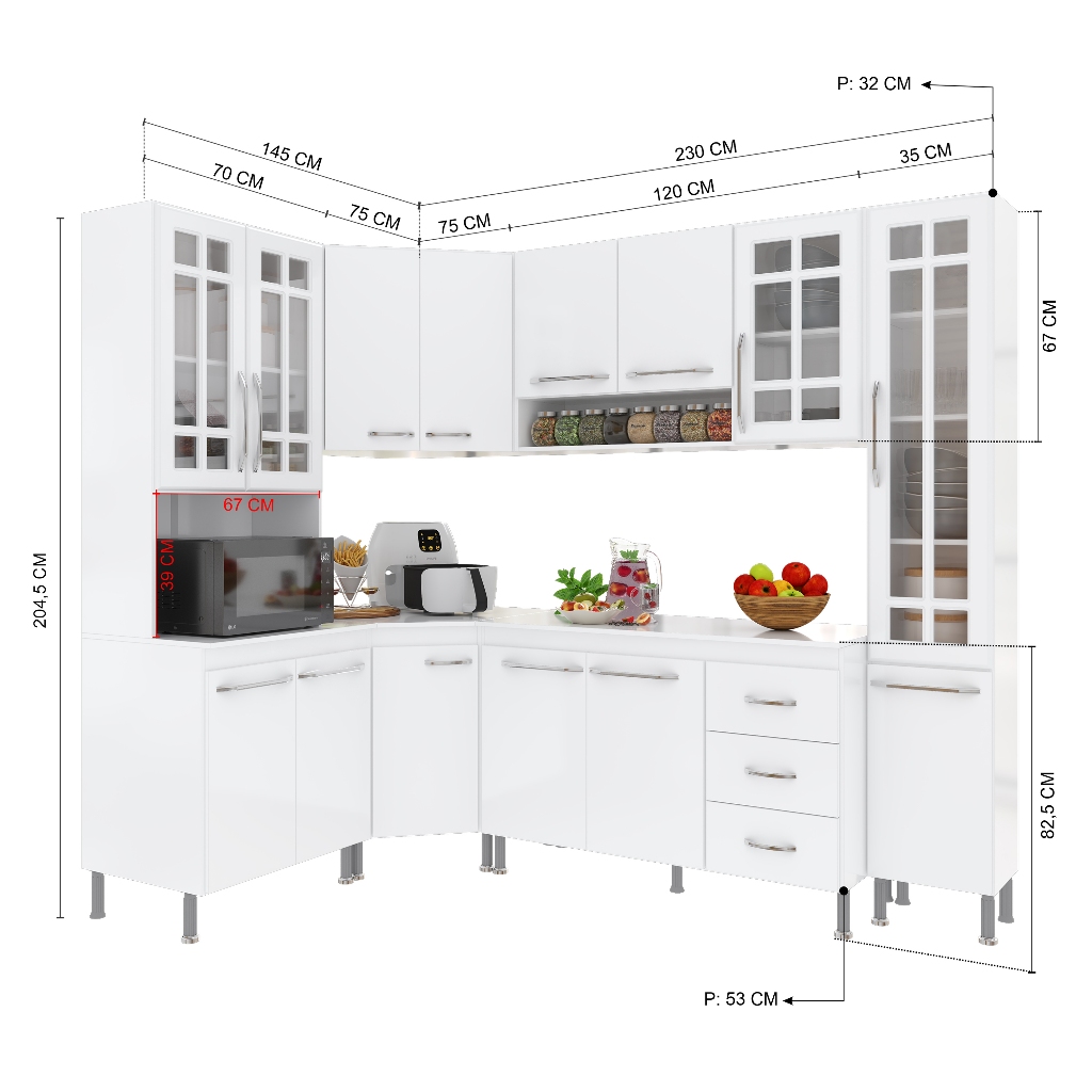 A Cozinha Viena da Fidelitá combina elegância e funcionalidade, trazendo um design sofisticado com linhas delicadas e um acabamento em pintura UV de alto brilho. Com módulos avulsos, cada peça é independente, permitindo diferentes composições para melhor aproveitamento do espaço. Seu interior é bem distribuído, com prateleiras e divisórias que auxiliam na organização de utensílios e mantimentos. Fabricada em MDP de 15mm, a estrutura garante resistência e durabilidade. As corrediças telescópicas e dobradiças metálicas proporcionam um deslizamento suave e seguro. Além disso, os puxadores cromados em ABS e os pés plásticos com regulagem de altura agregam praticidade e um toque moderno ao conjunto. Dimensões: 📌 Largura total: 375cm 📌 Altura total: 204,5cm 📌 Profundidade: 53cm (balcões) | 32cm (aéreos) 🔧 Os balcões acompanham tampos de MDP 15mm removíveis, possibilitando a instalação de uma pia com espaço de 120cm x 52cm no balcão (120cm). 🔥 O balcão (70cm) suporta cooktop, o mesmo não vai recortado e para sua customização o gabarito esta na própria embalagem. Itens inclusos: ✅ Torre Quente (70cm) – 4 portas (2 de vidro) e espaço para forno/micro-ondas sendo (Altura: 39cm x Largura: 67cm x Profundidade: 53cm) ✅ Aéreo de Canto (75cm) - 2 portas ✅ Balcão de Canto (75cm) - 1 porta ✅ Aéreo (120cm) – 3 portas (1 de vidro) ✅ Balcão (120cm) – 3 portas, 3 gavetas e tampo removível ✅ Paneleiro Simples (35cm) – 2 portas (1 de vidro) Informações Importantes: 🛠️ Montagem: O produto segue desmontado, com manual de instalação e todas as ferragens necessárias. A Fidelitá Móveis não realiza montagem. 📅 Garantia: 6 meses para defeitos de fabricação. 🖼️ Imagem meramente ilustrativa. ⚠️ Verifique as dimensões do espaço disponível antes da compra Perguntas Frequentes : 🔹: Os módulos podem ser montados separadamente ou apenas na disposição da imagem? Sim! Como os módulos são avulsos, você pode organizá-los conforme seu espaço e necessidade. 🔹: O balcão suporta pia de inox ou granito? Sim! O tampo de MDP de 15mm pode ser removido para instalação de uma pia de até 120cm x 52cm pesando até 40kg. 🔹: Os pés da cozinha são reguláveis? Sim! Os pés são de plástico resistente e possuem regulagem para nivelamento do móvel acrescentando mais 3cm sobre a altura total. 🔹: A Fidelitá realiza a montagem da cozinha? Não. O produto é enviado desmontado, acompanhado pelo manual de montagem e todas as ferragens necessárias para a instalação. 🔹: Os puxadores são de metal? Não. Os puxadores são em ABS cromado, garantindo leveza e resistência.