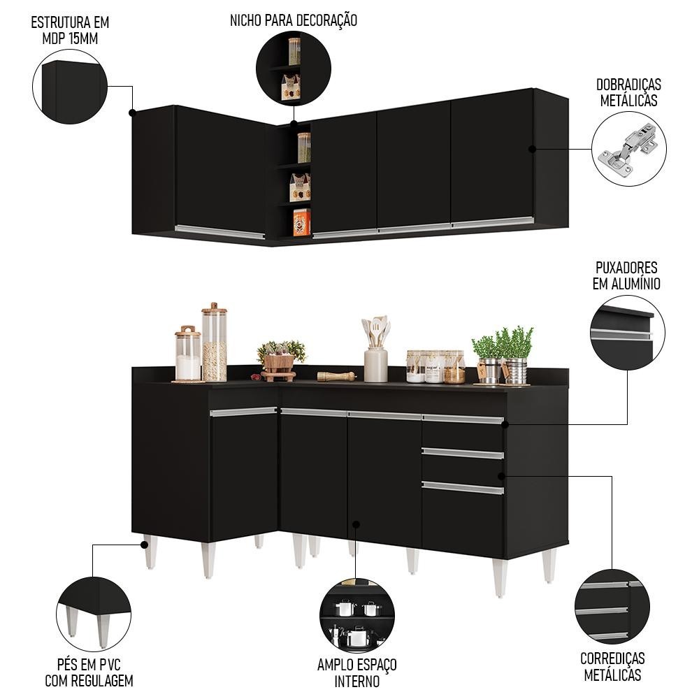 Armário de Cozinha Modulado de Canto Direito 4 Peças CP38 Balcão com Tampo Preto - Lumil
