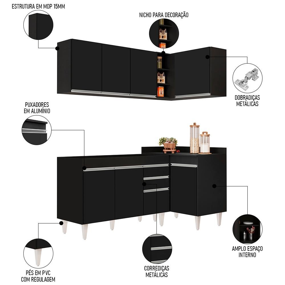 Armário de Cozinha Modulado de Canto Esquerdo 4 Peças CP46 Balcão sem Tampo Preto - Lumil